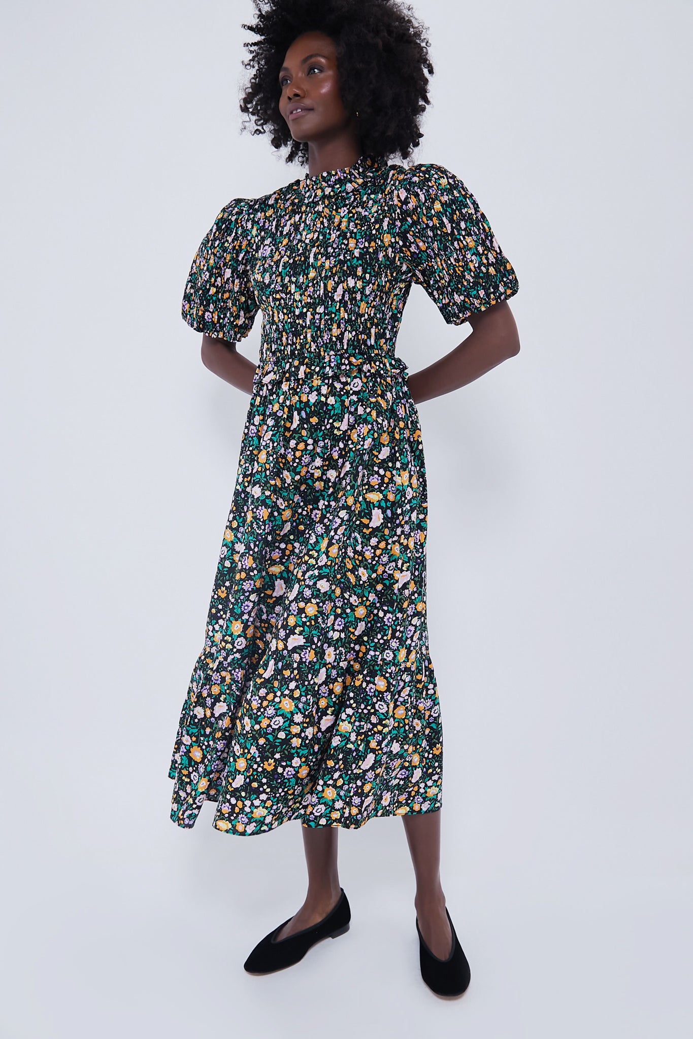 Black Multi Floral Smocked Samantha Midi Dress