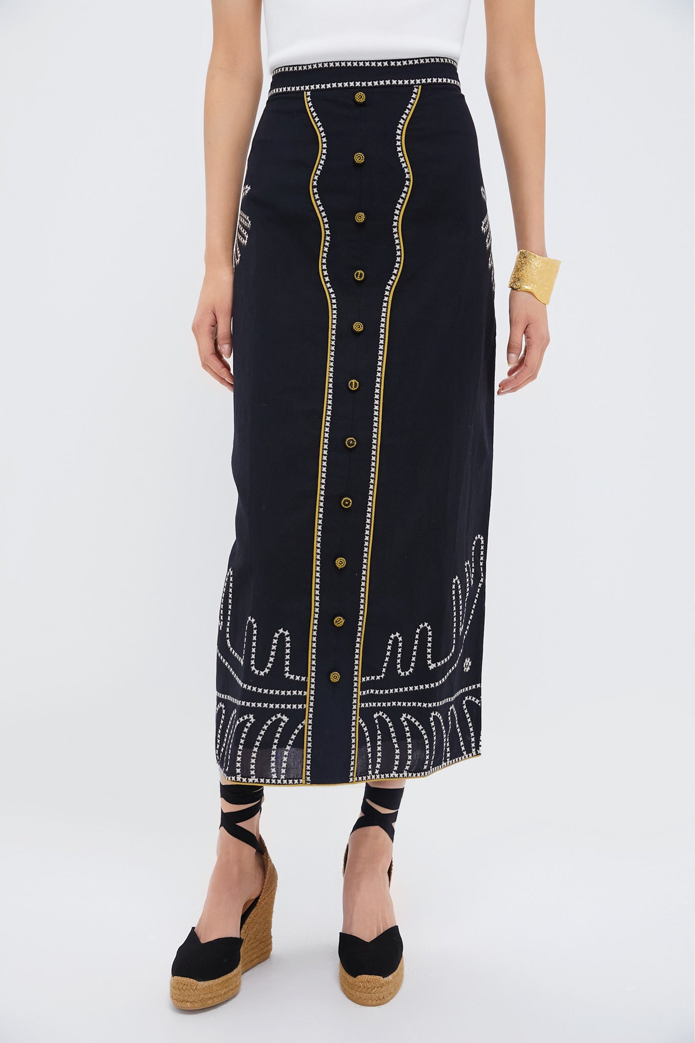 Black and Gold Silk Button Skirt