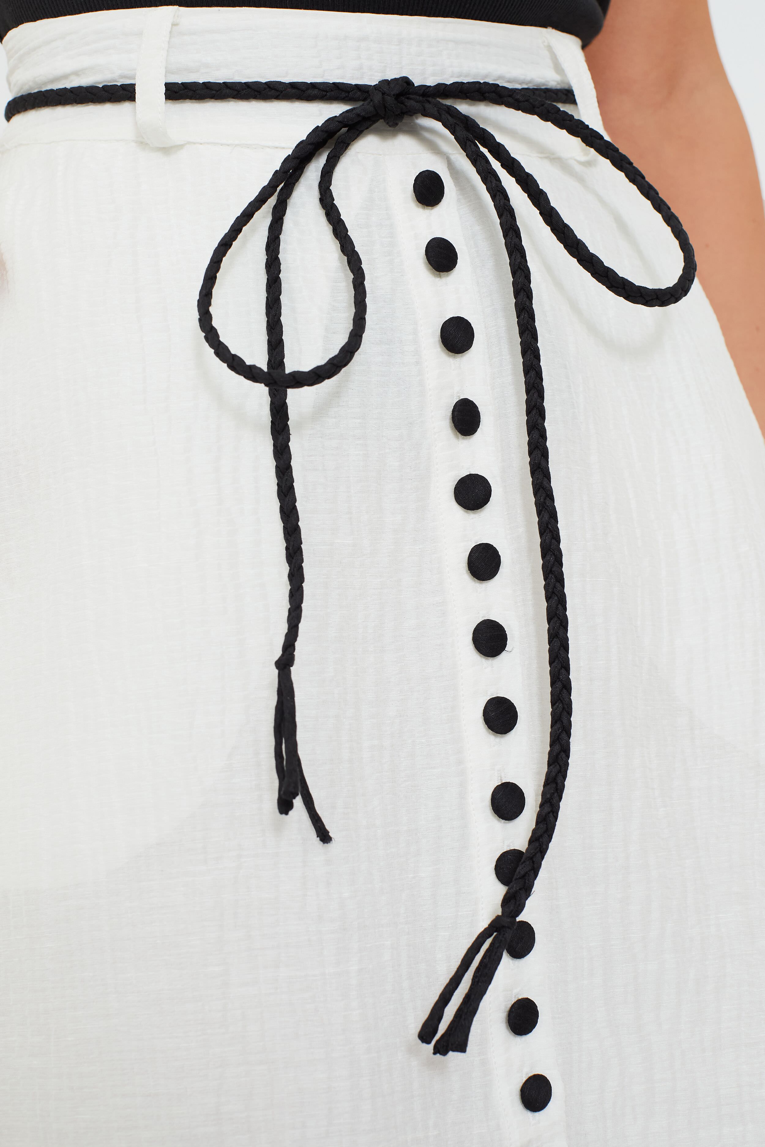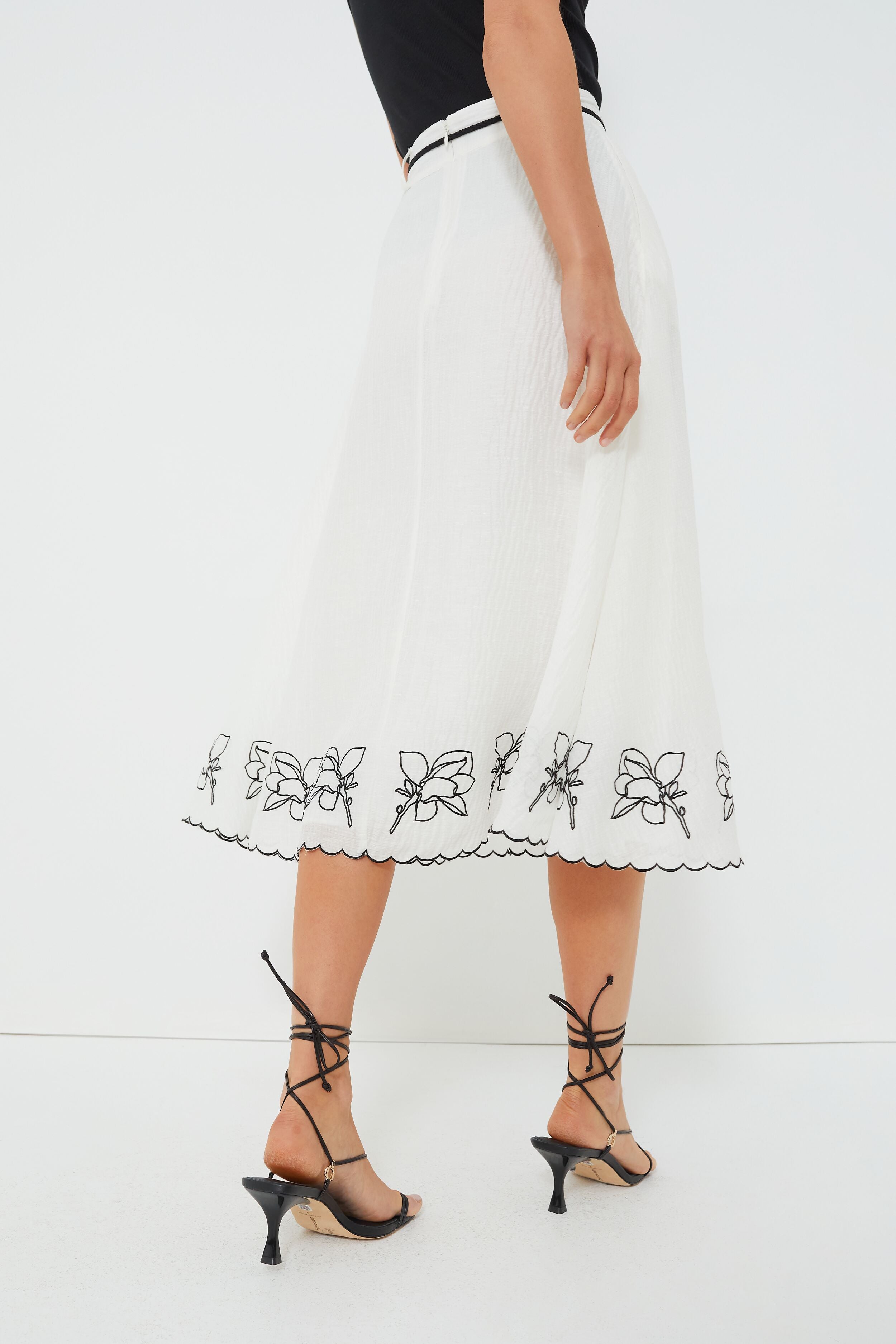 You will be poised and elegant in the Alba Black Grace Silk Linen Skirt. This midi is a full circle skirt. made from an airy silk linen blend with embroidered detailing along the scalloped hem. The self-tie waist allows for a perfect fit. and the front button placket is classic and cute. Pair with a simple black turtleneck. or with the Alba Black Gabriella Silk Linen Shirt for an unforgettable matching set.