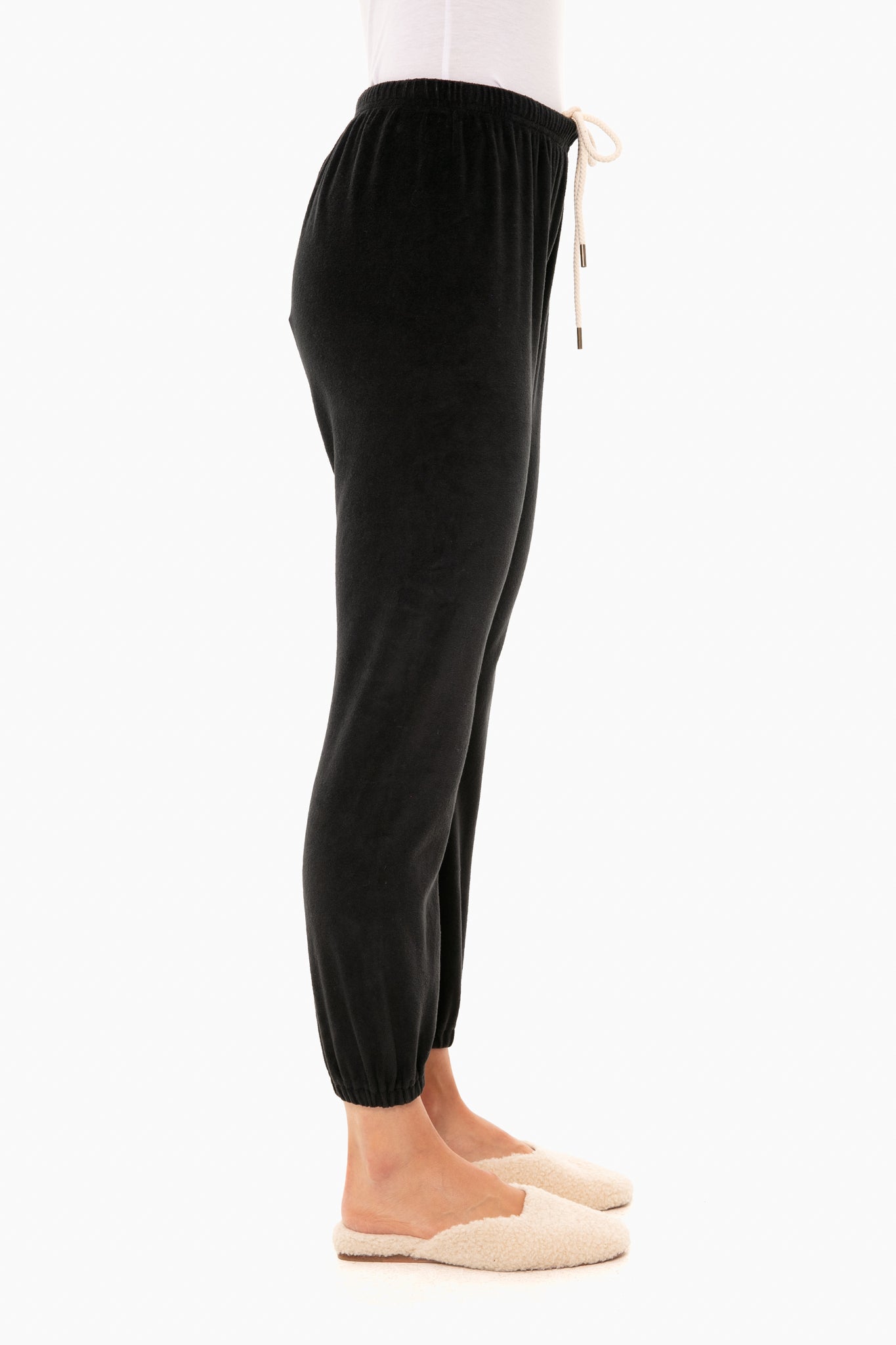 Nostalgic and textured. the Almost Black Velour Sweatpant is made from the softest fabric with a drawstring elastic waistband and cuffs. Pair with the matching pullover for a modern and chic take on the classic velour set.