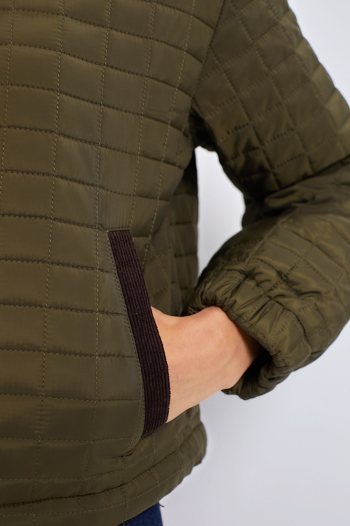 The Army Green Mason Jacket will instantly pull your outfit together. With corduroy trim. a box quilt construction. and a flattering length. this is perfect for throwing on during chilly days for style and warmth!
