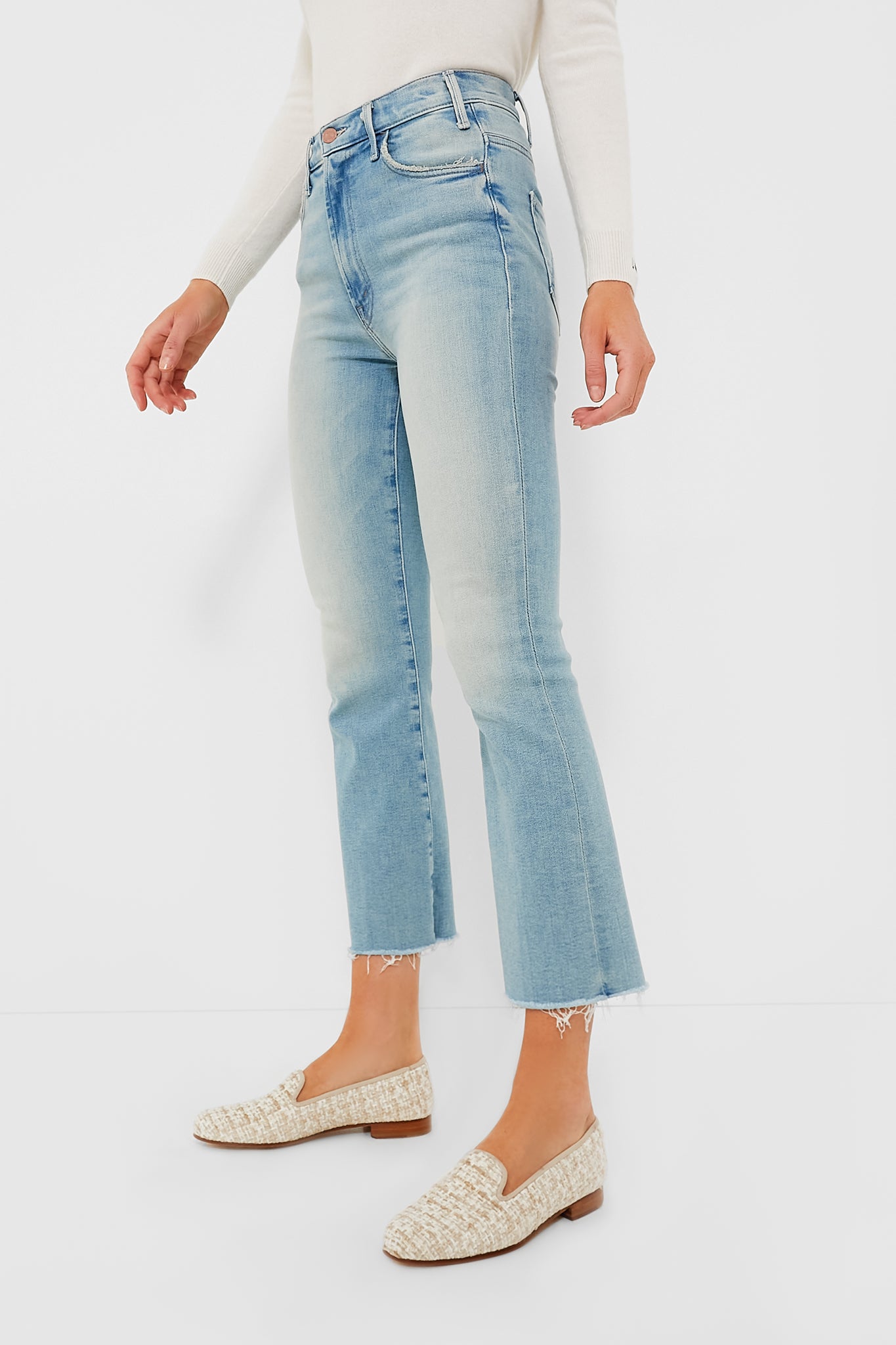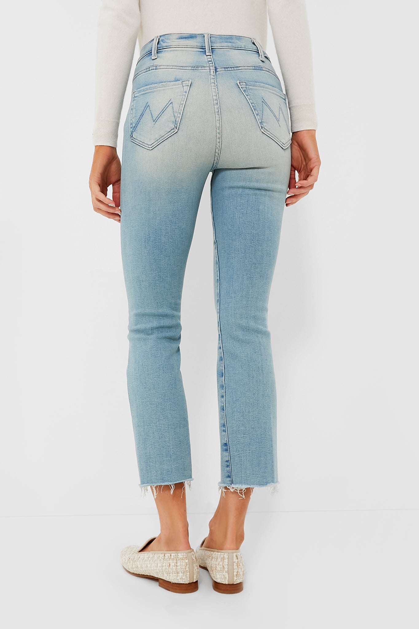 Featuring a cropped inseam and frayed ankle in a soft and stretchy light wash. there is no question why the Hustler Ankle Fray is one of MOTHER's best-selling styles. We are loving these with a boho blouse and clogs for a fresh. weekend look to grab cappuccinos with friends or with a chunky knit and sneakers for a walk around town.