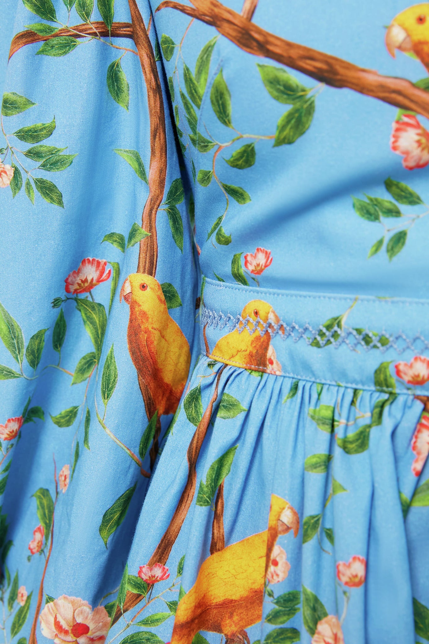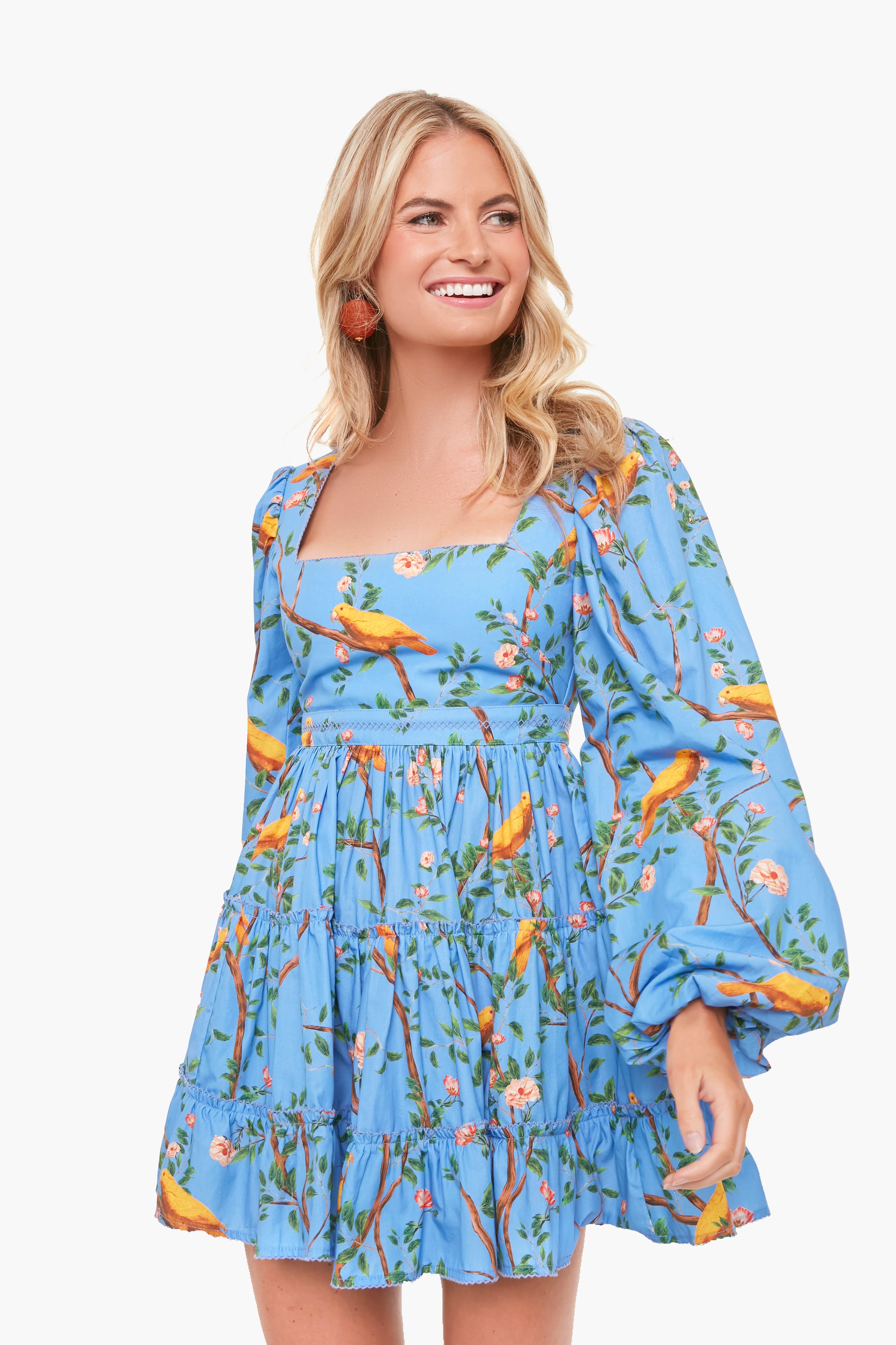 The Azul Avena Dress has a square neckline. voluminous long sleeves. and a flouncy tiered mini skirt. Made from crisp cotton poplin and printed with a floral and fauna motif. this style is timeless and feminine. We are adding sandals and statement earrings for special celebrations!