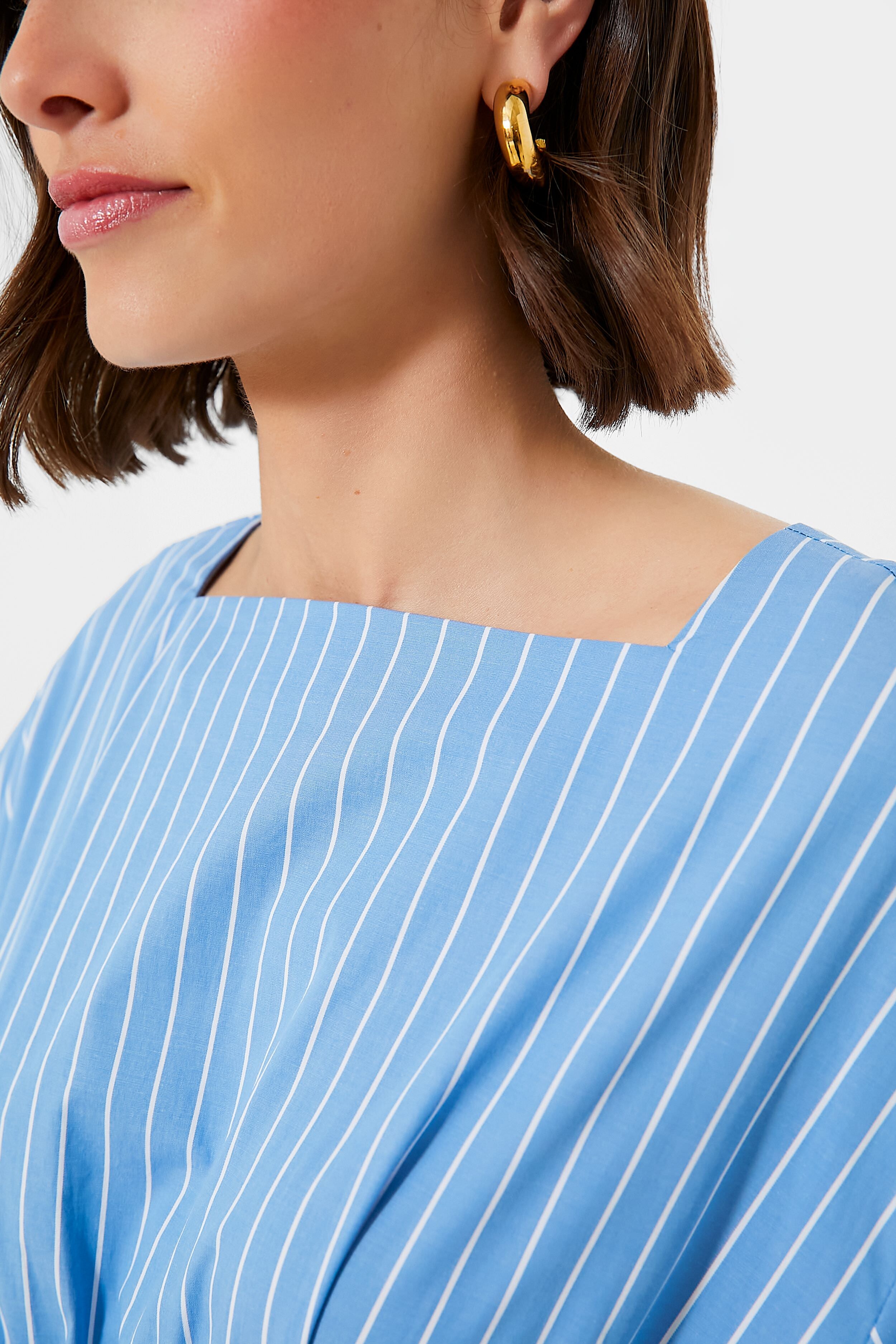 This eye-catching number takes your everyday staple wardrobe to the next level. The Azure Pinstripe Amy Dress features a high square neckline. short sleeves. and a wide elastic waistband. This maxi nods to a shirt dress with the classic pinstripe cotton fabric. but adds unique and elevated details. Pair with ballet flats are sandals!