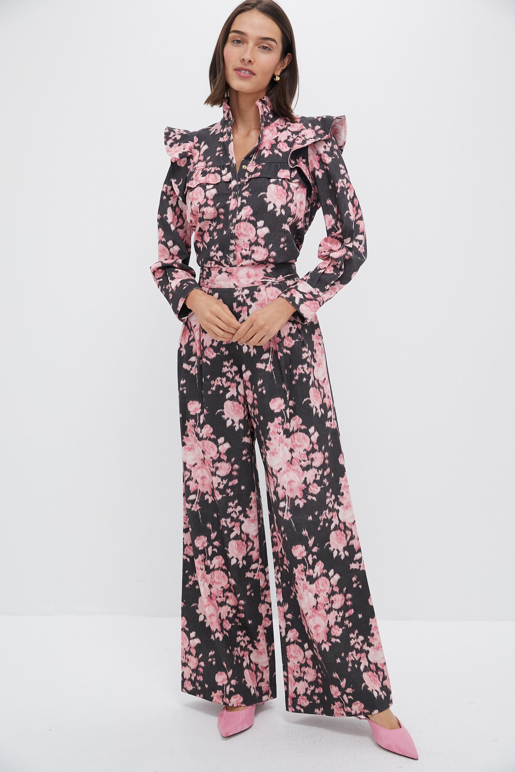 We are obsessing over the Denim Nate Pants. Made with a statement-making wide leg and comfortable waist band. and decorated with an elegant floral print that is seasonless in design. Pair with a black sweater and boots. a flirty slim fit top and heels. or with the Beaux Valette Ruched Sola Top for a bold set!