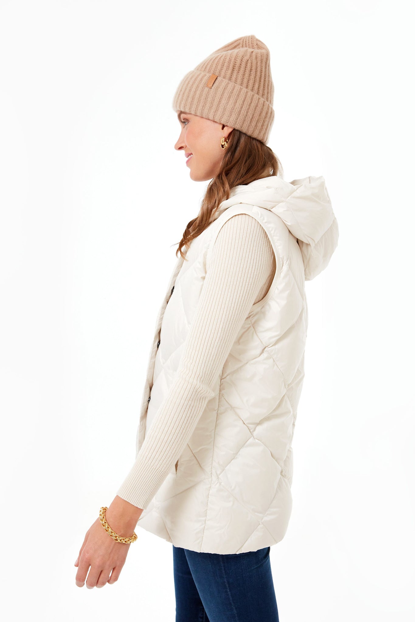 The Beige Frutto Vest is an easy layer that instantly elevates your transitional wardrobe when added on top of any outfit. With an attached hood. welt pockets to keep your hands warm. and tonal grosgrain trim to complement the quilted texture. this silhouette is such an elegant piece of outerwear. We love to wear it over a turtleneck and add a beanie for a super cozy look!