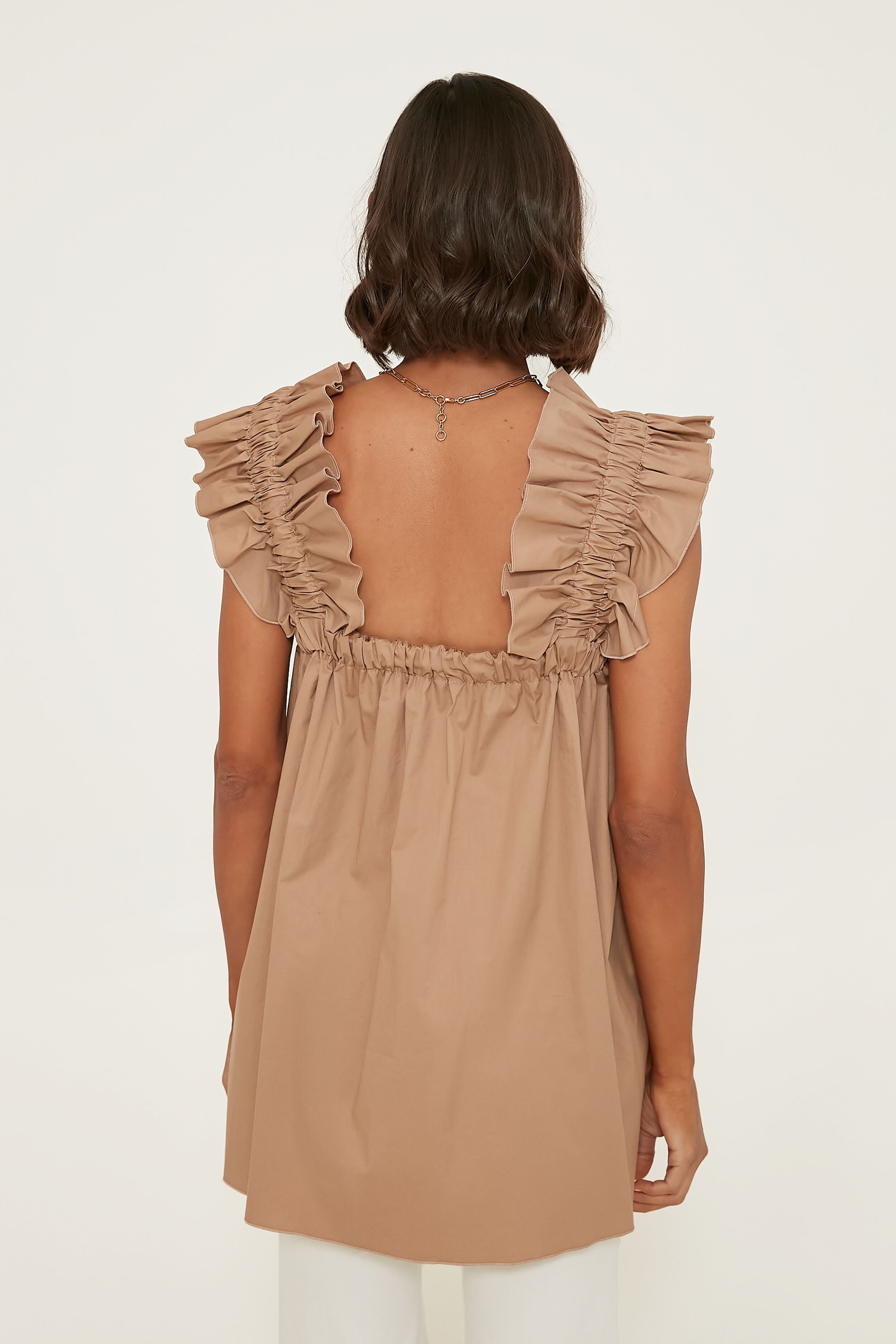 We can't help but think of days spent in the sunshine in the Beige Maya Long Top with its feminine silhouette and chic colorway. Crisp cotton with a touch of stretch takes this silhouette up a notch. and the fun and flirty oversized ruffles at the shoulders keep things light. This breezy. A-line tank is a necessity when the days get hot — it is so effortless that all you have to do is style with white denim. sandals. and sunnies for a casual-cool look.