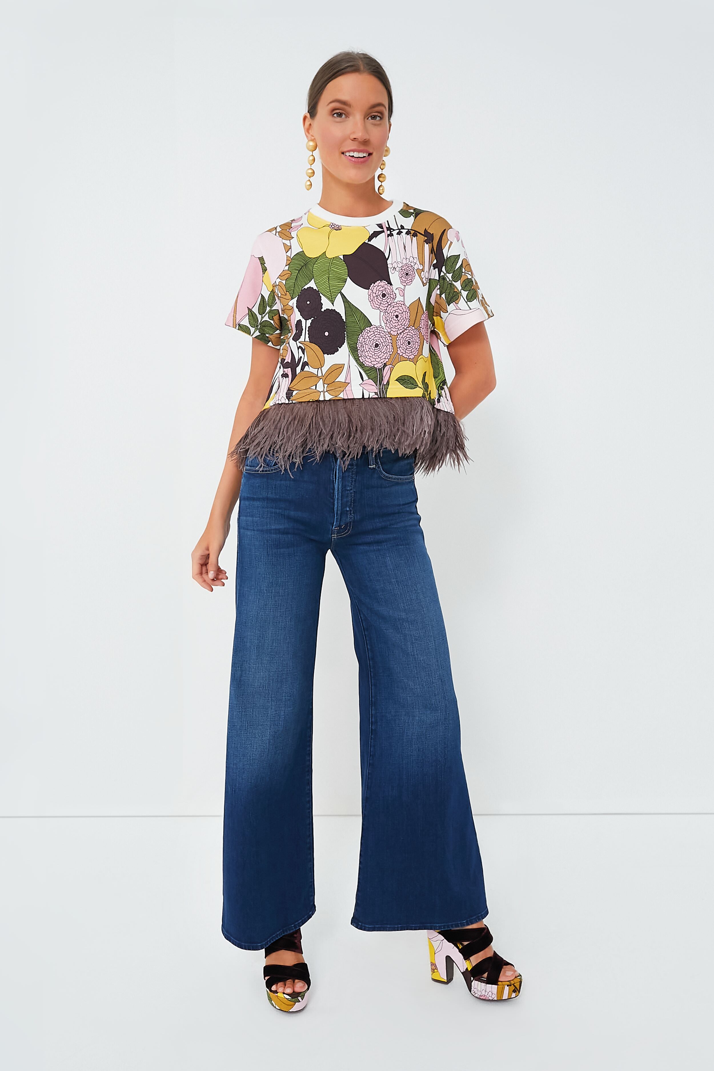 Want to add a little drama to the everyday? Allow the Big Flower Rose La Scala Tee to take to the stage. This beauty features a cropped T-shirt silhouette with a fabulous contrast ostrich feather trim. As great for a sassy city look as it is for special events. this is a staple for your closet with plenty of fun details. Style with high waisted jeans and pumps for date night. or with a mini skirt and a clutch for your next RSVP!