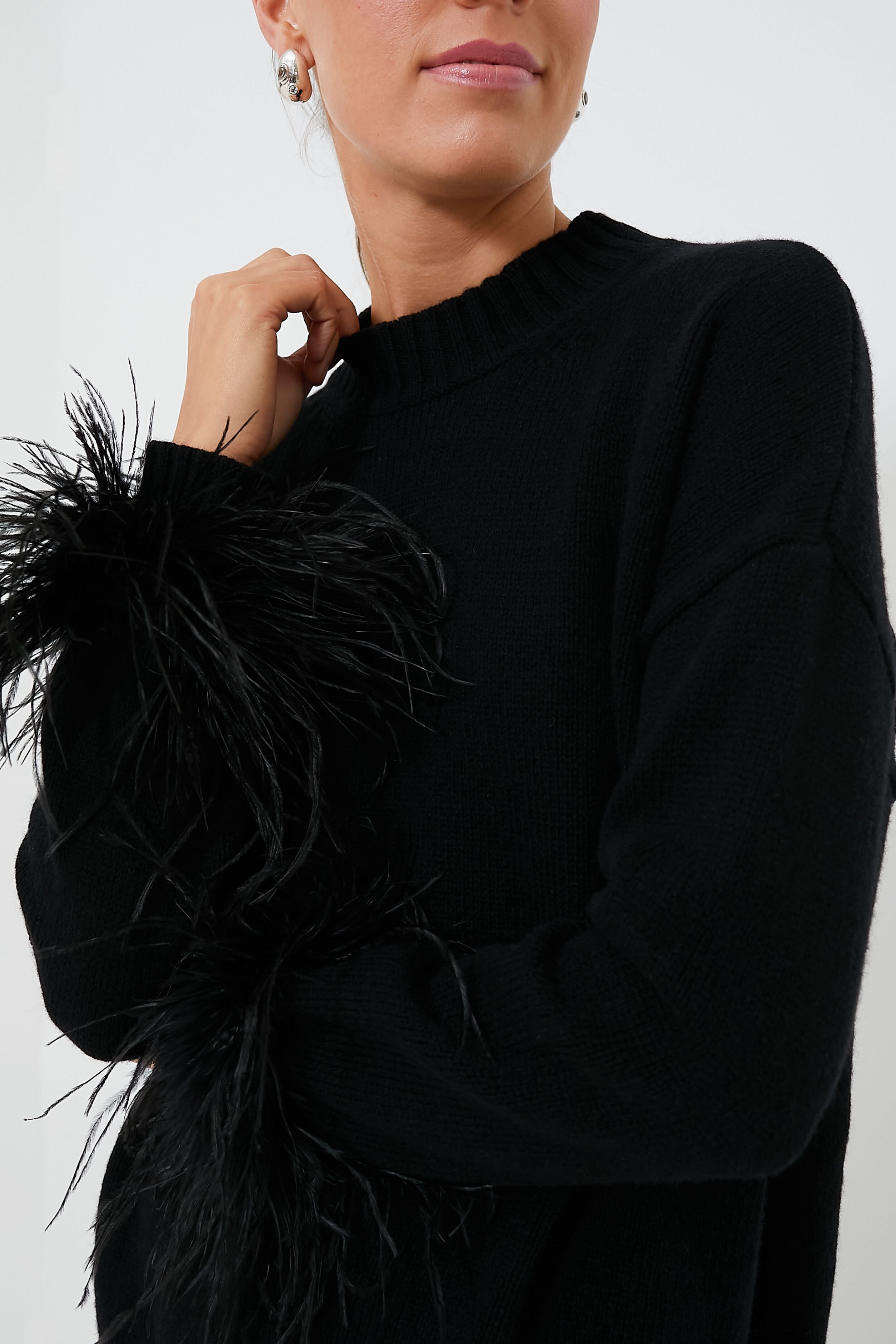 The Black Agatha Wool Sweater offers a fun and fashionable way to stay cozy. Beautifully crafted from a luxuriously soft wool and cashmere blend. this piece features a mock neckline. high side slits. and an ostrich feather trim we love! We are styling this silhouette with high waisted denim and flats for an elevated everyday look. or dressed up with a tailored skirt and heels for evening wear.