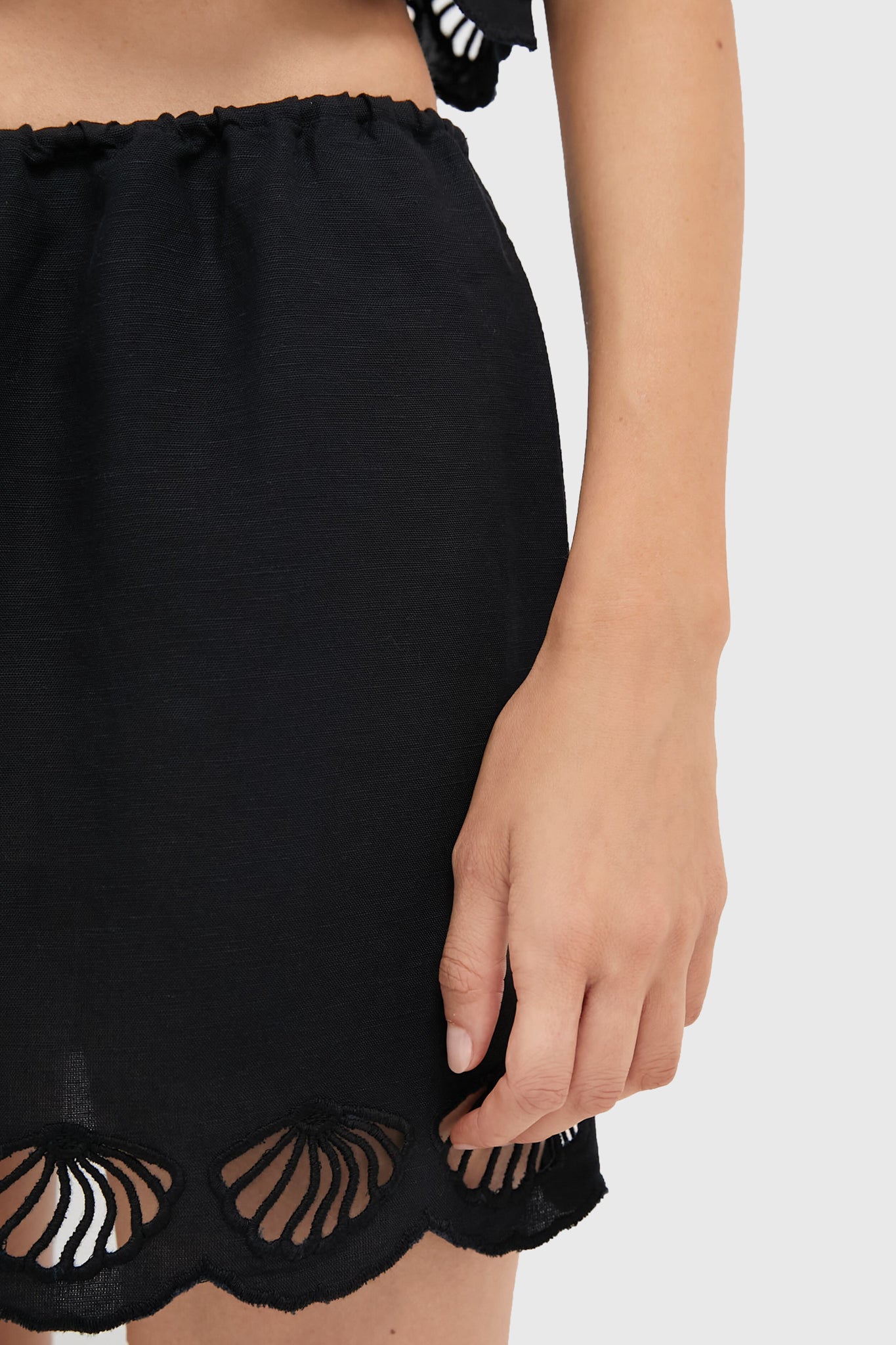 This chic miniskirt is traced with delicate scalloped edges and seashell embroidery along the hem for a subtle. yet elegant touch. Pair with the matching Black Air Linen Scallop Tank and sandals for an adorable coordinating set!