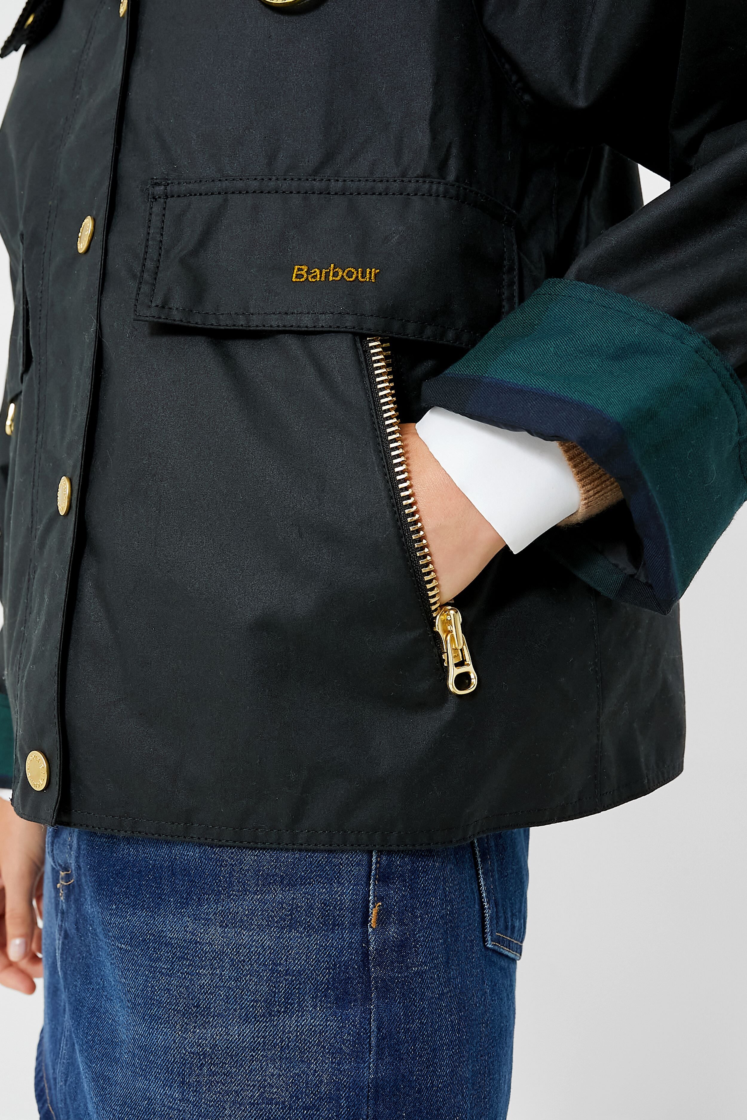 Taking a timeless look and giving it a touch of edge. we can't get enough of the Black and Sage Tartan Catton Wax Jacket. With modern details like an oversized corduroy collar that makes a statement. a cropped hem length that's perfect for pairing with high waisted bottoms. and plenty of gold hardware in the form of a D-ring. snaps. and zippers throughout. this is a cool-girl take on a classic. Style with a mini skirt and loafers for a flirty styling. or go for wide leg denim and chunky boots as the temps drop.
