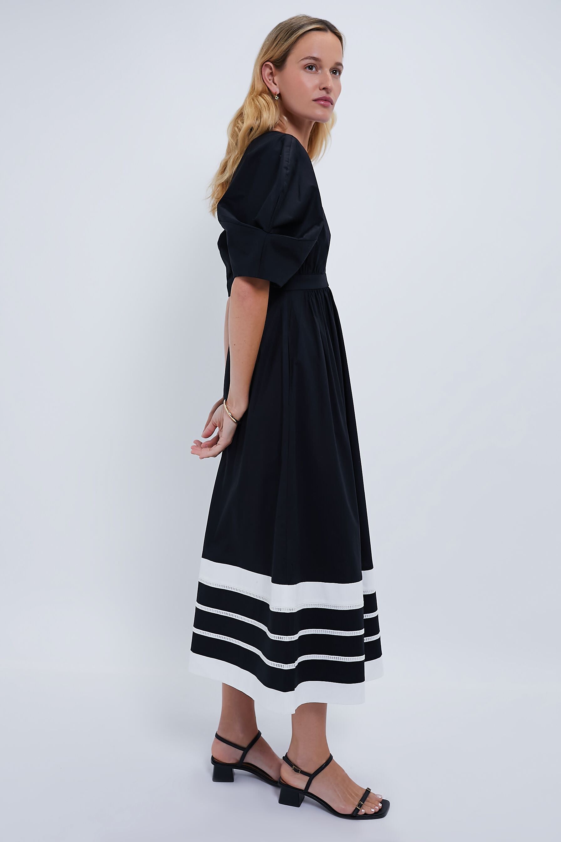 Dramatic. bold. and beautiful. the Black and White Miel Dress is THE event look of the year. With a deep V-neckline oversized short puff sleeves. and an empire waist that extends into an A-line skirt. this look is elegant and incredibly flattering. Pair with black heels and add some color with a fun clutch!