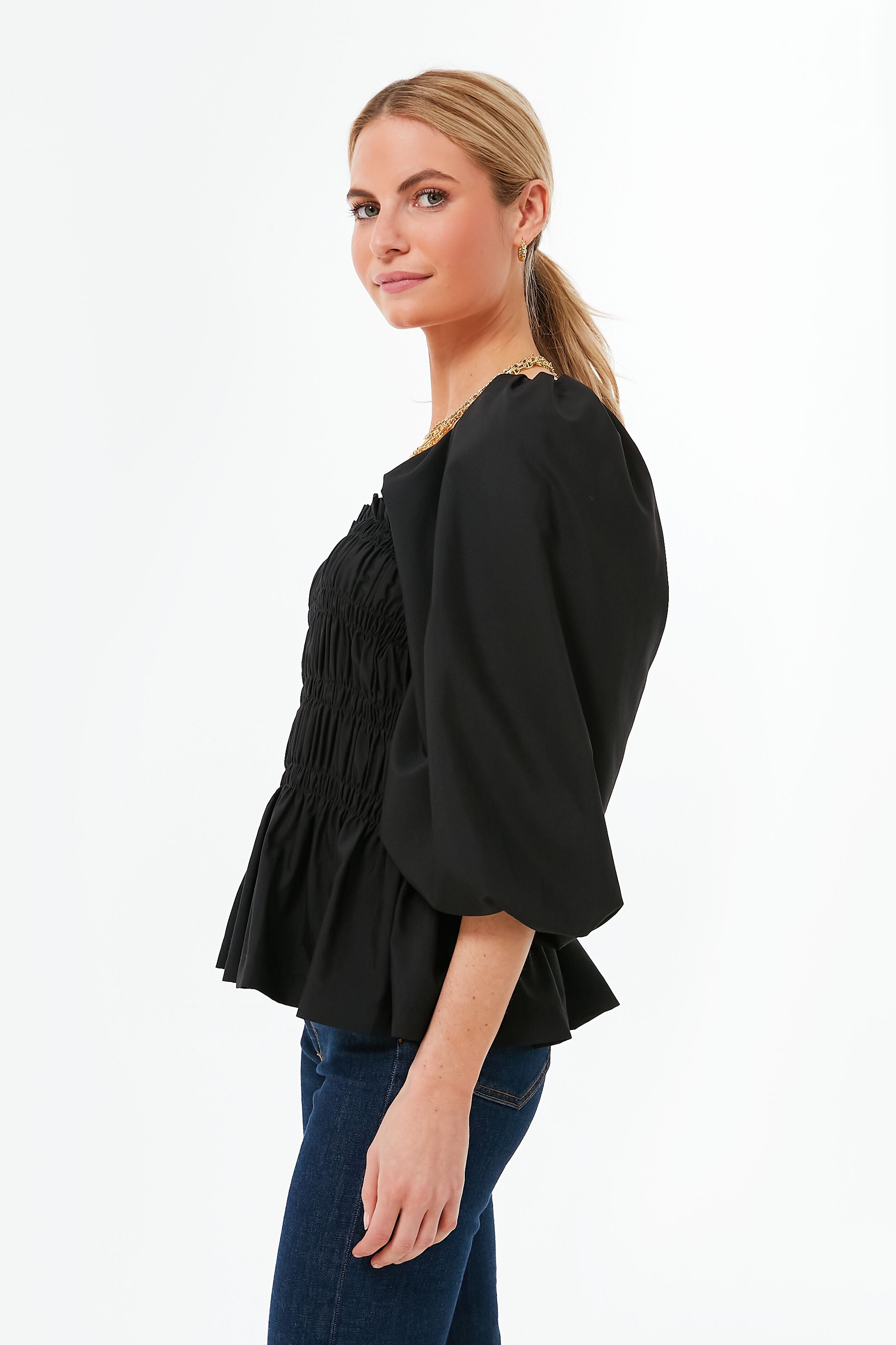 Sweet ruffles and ruching details make the Black Annabelle Blouse so special. Elevated in all back. this square neckline number can effortlessly be dressed up with heels or made casual with light denim and flats. With a smocked bodice to create the perfect and most flattering fit. we are wearing this any and everywhere from desk to drinks. all year long.