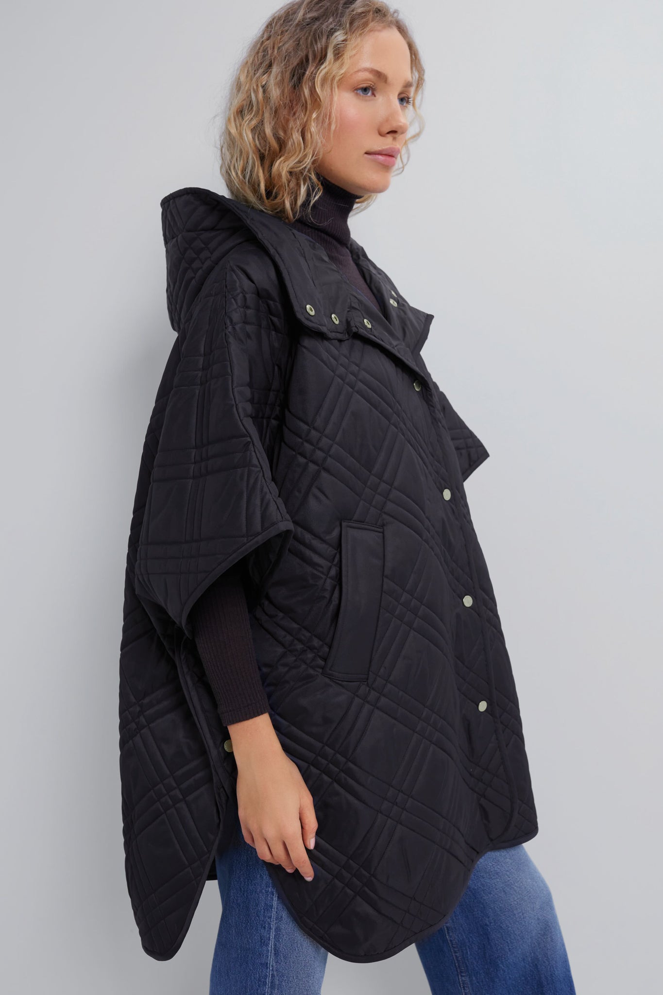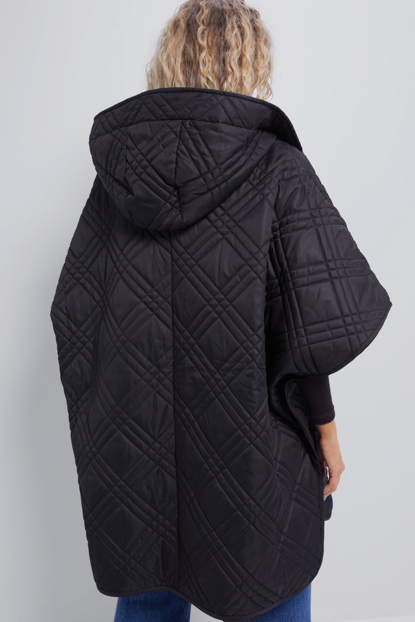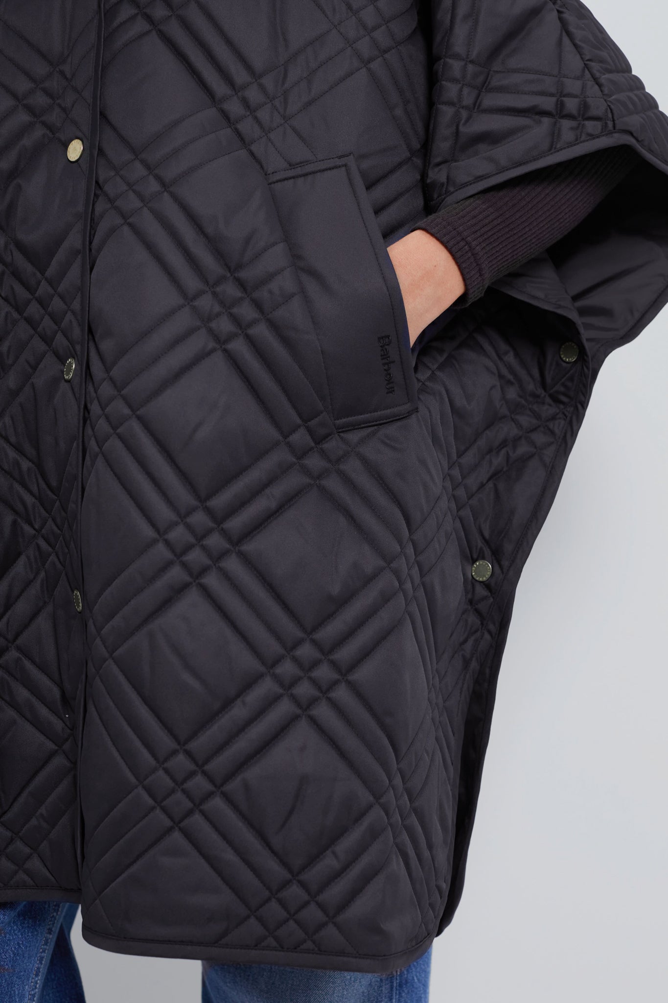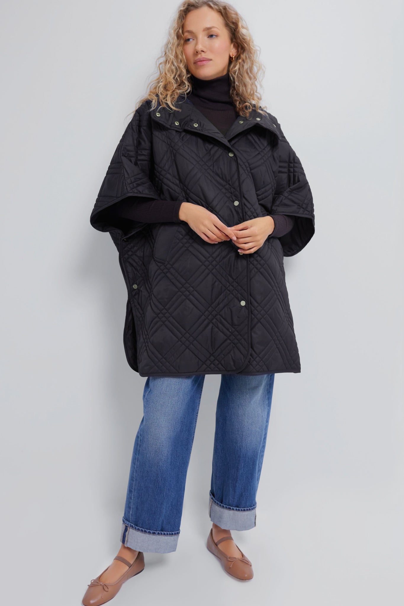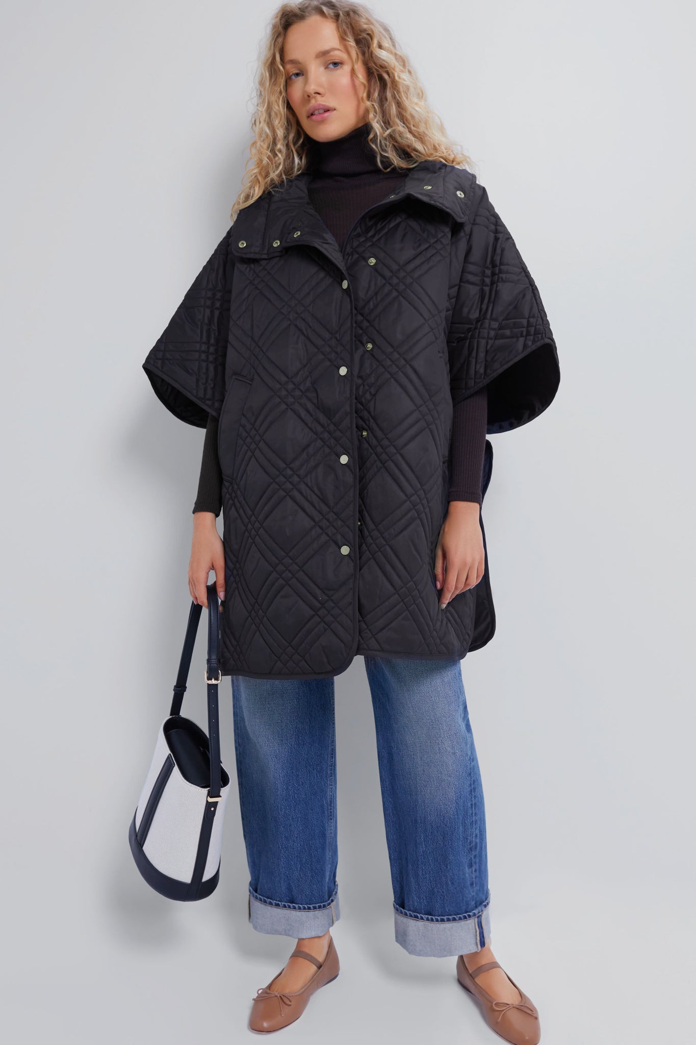 Inspired by the brand's classic tartan. the Black Astor Quilted Cape features a tartan quilt and is detailed with a studded fastening and open sides making it perfect for chunky winter layering. Perfect for slightly chilly fall nights in the city. we are wearing this piece with denim. and boots for a stylish yet warm look.