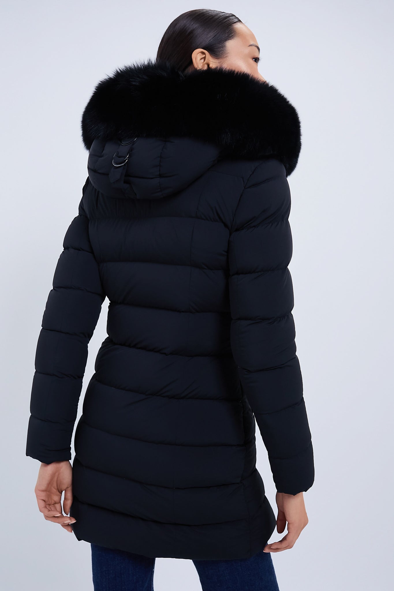 The Black Calla Coat is a longline down-filled parka in a flattering. fitted silhouette. Made to keep you warm without sacrificing style. it features an attached hood with a removable fur trim. leather trimmed pockets. and an on-trend puffy quilted exterior that will have you feeling cozy all day long. Wear this sleek yet functional outerwear over a turtleneck when snow is falling. then add boots and a beanie for that aprés ski look.