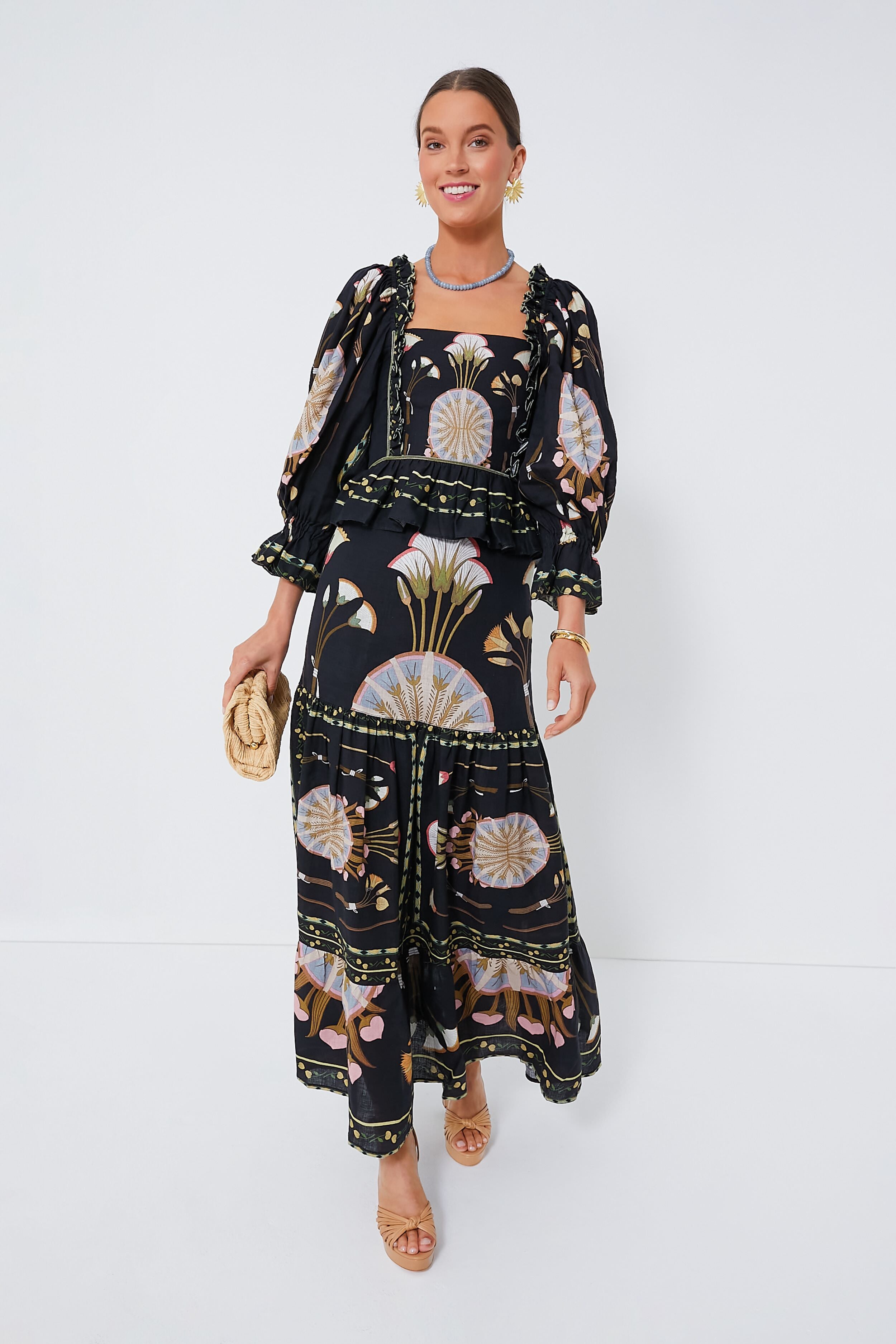 The Black Cassia Skirt is a gorgeous and playful skirt that is ready to add some freshness to your wardrobe. Complete with ruffled trim. a twirl-worthy tiered silhouette. and beautiful embroidered details throughout. this stunner is a breath of fresh air. Pair it with the matching Daphne top or with an easy tee and raffia accessories for an elevated beachy look on your next vacation!