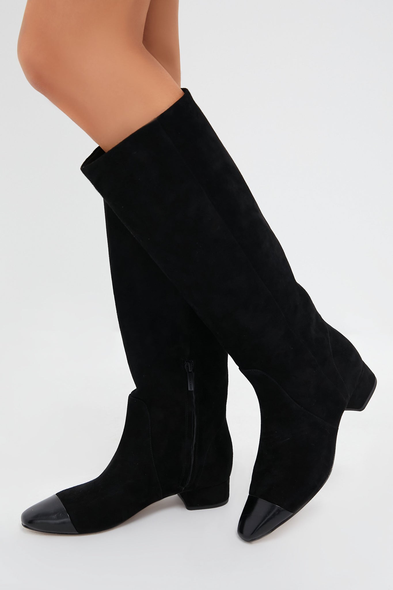 Expertly crafted from luxe suede. this knee high. cap-toe boot style features a tapered square toe and a low one-inch block heel for easy support. Pair with jeans and a button-down—this adds instant polish.