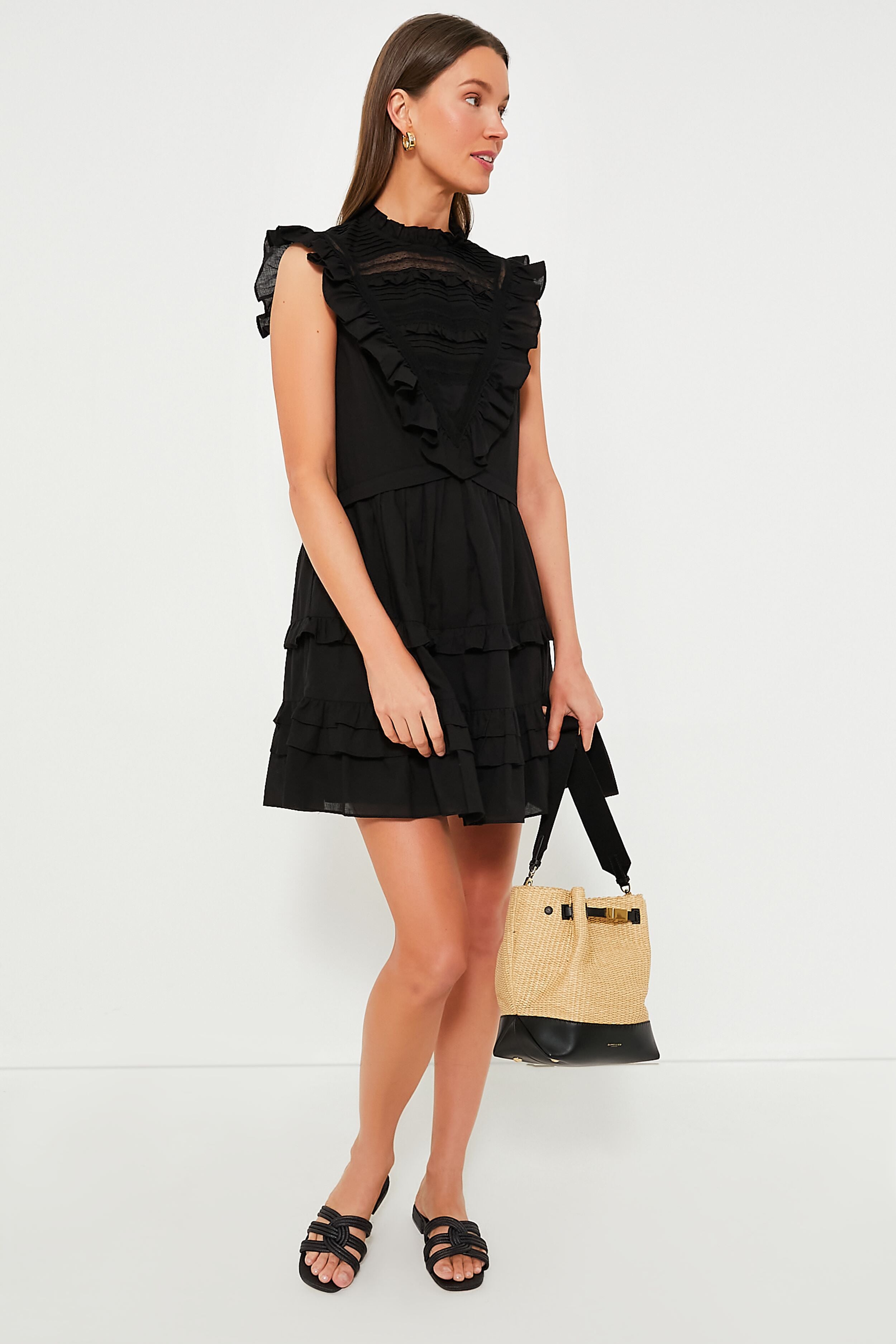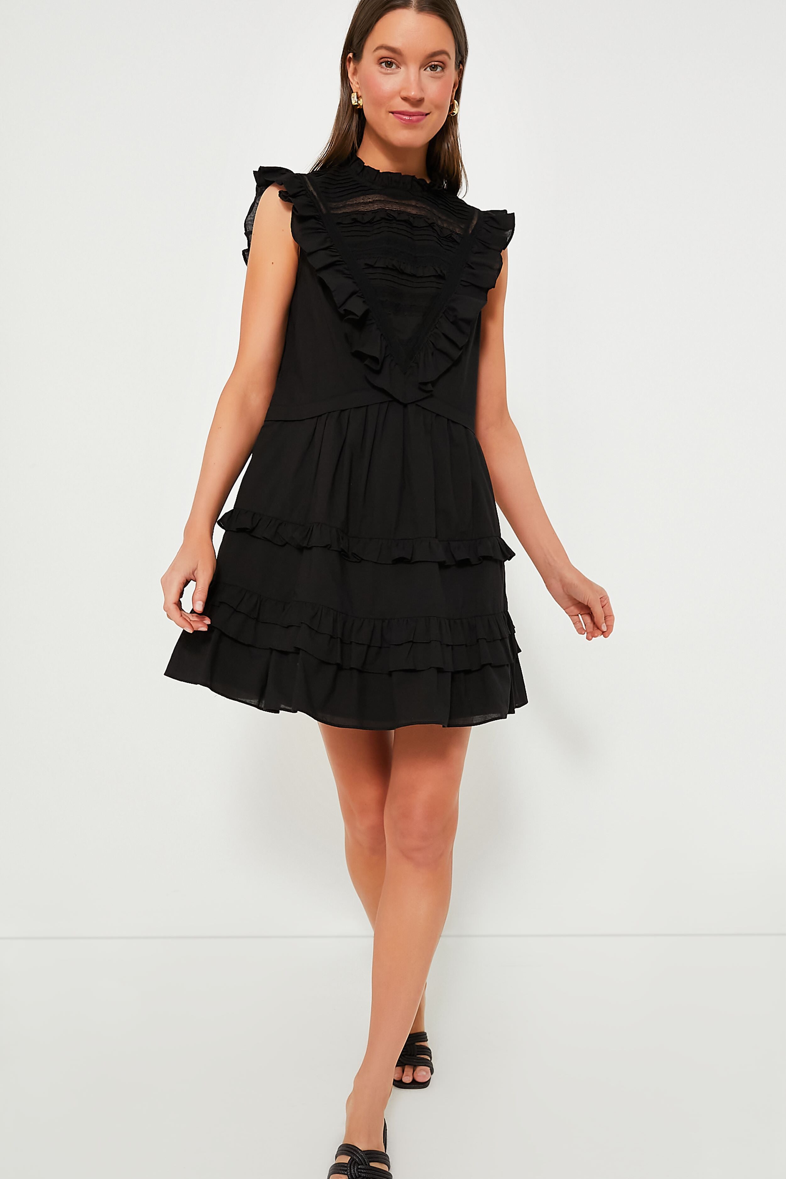 The Black Cecilia Ruffle Dress takes your classic LBD and elevates it with feminine details! This mini boasts ruffles along the collar. sleeves. bodice. and skirt. for a flattering A-line silhouette that is decorated to the nines. Pair with ballet flats or sandals and accessorize with gold!
