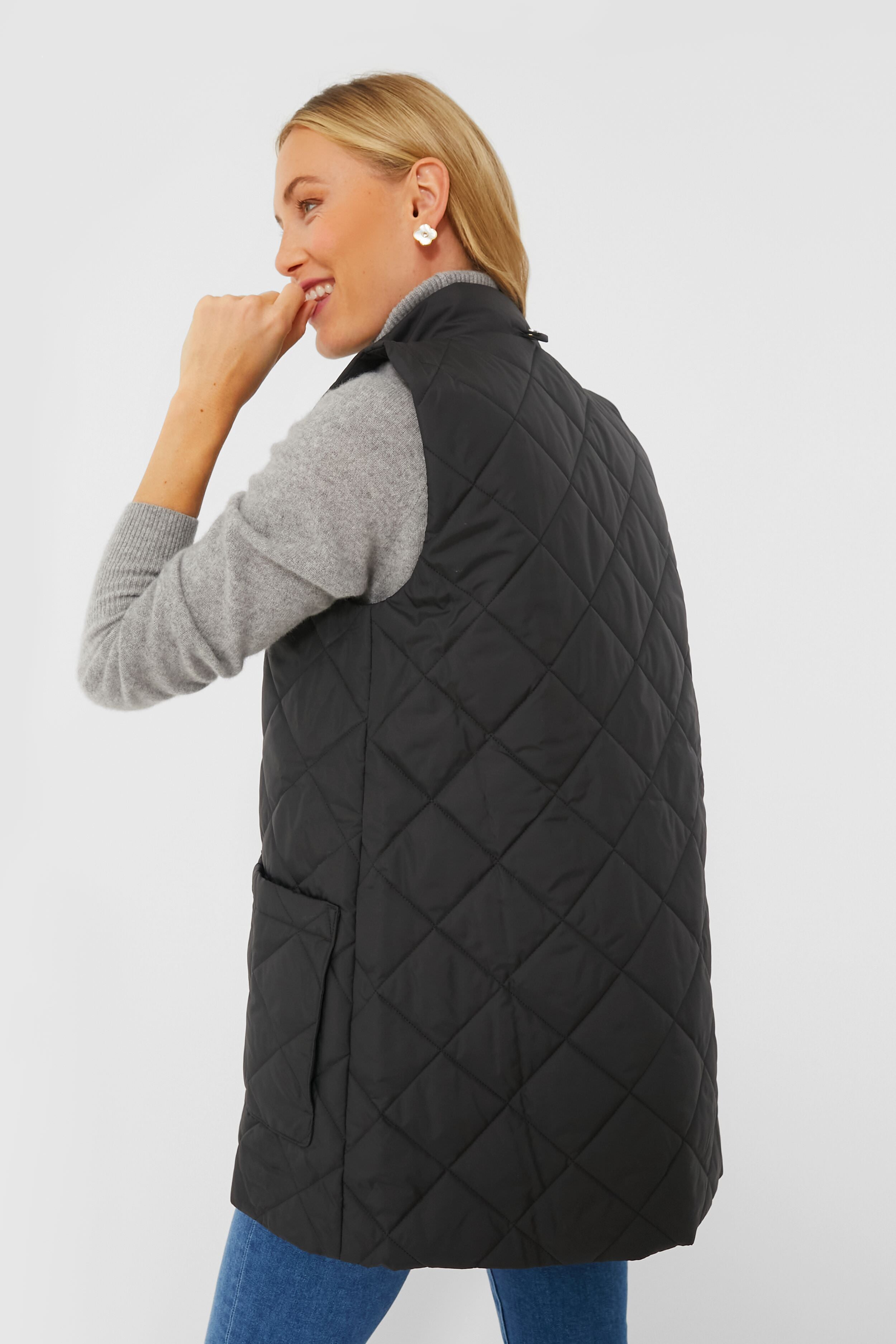 The Black Cosmia Liner is the perfect lightweight layer to help you keep warm in cool weather. This diamond-quilted vest is made with generous front patch pockets at the hips and a wind-blocking stand collar to keep the chill out in style. Wear this chic outerwear style over a striped long sleeve for a classic look. or with a turtleneck for an extra cozy feel.