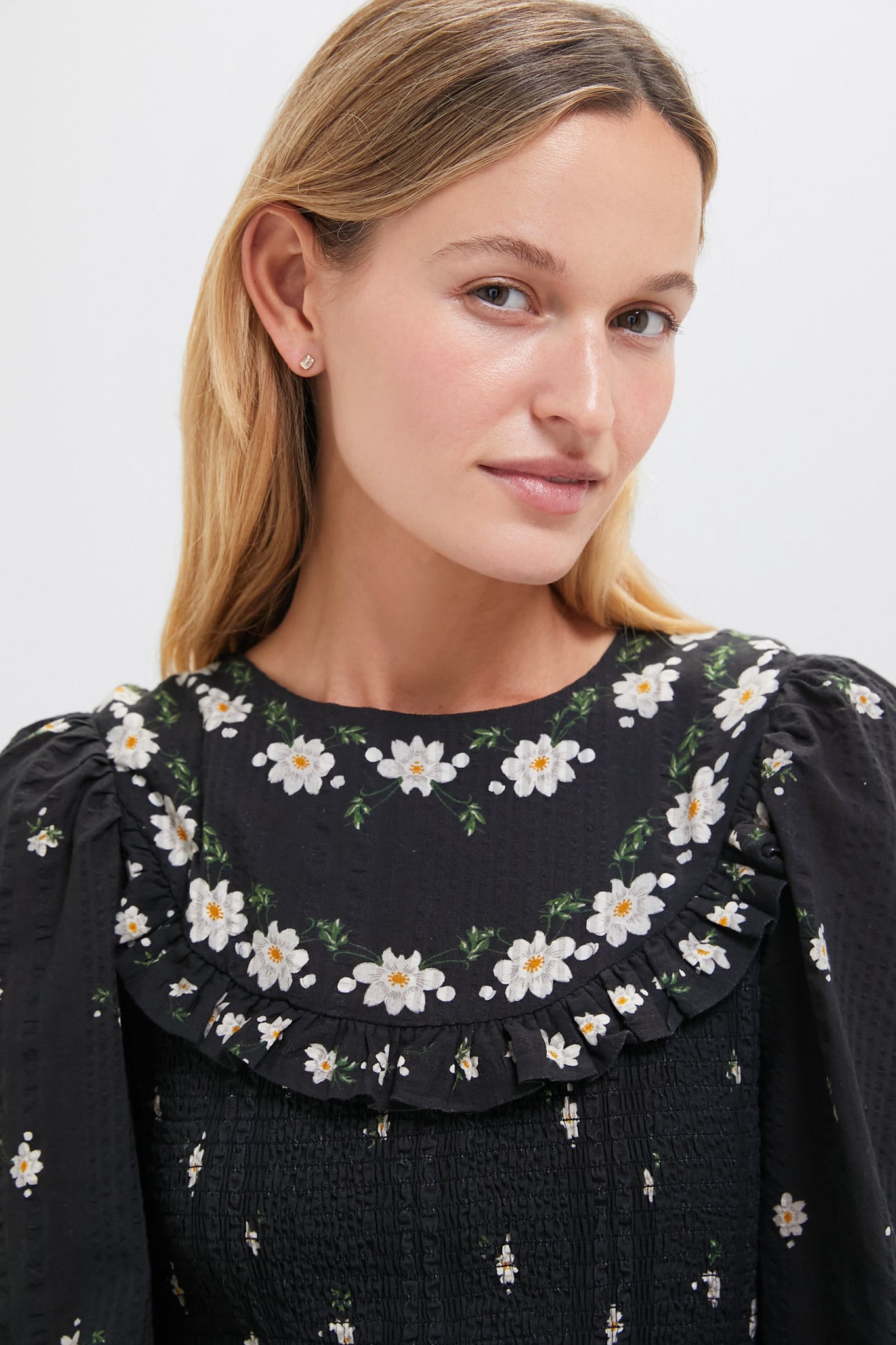 The Black Elizabeth Print Dress features long voluminous puff sleeves. ruffle detailing. smocked bodice. With beautiful floral print. this midi is perfect for dressing up or down. We are styling it with simple flats for coffee meetings. or with heels and a clutch for date nights!
