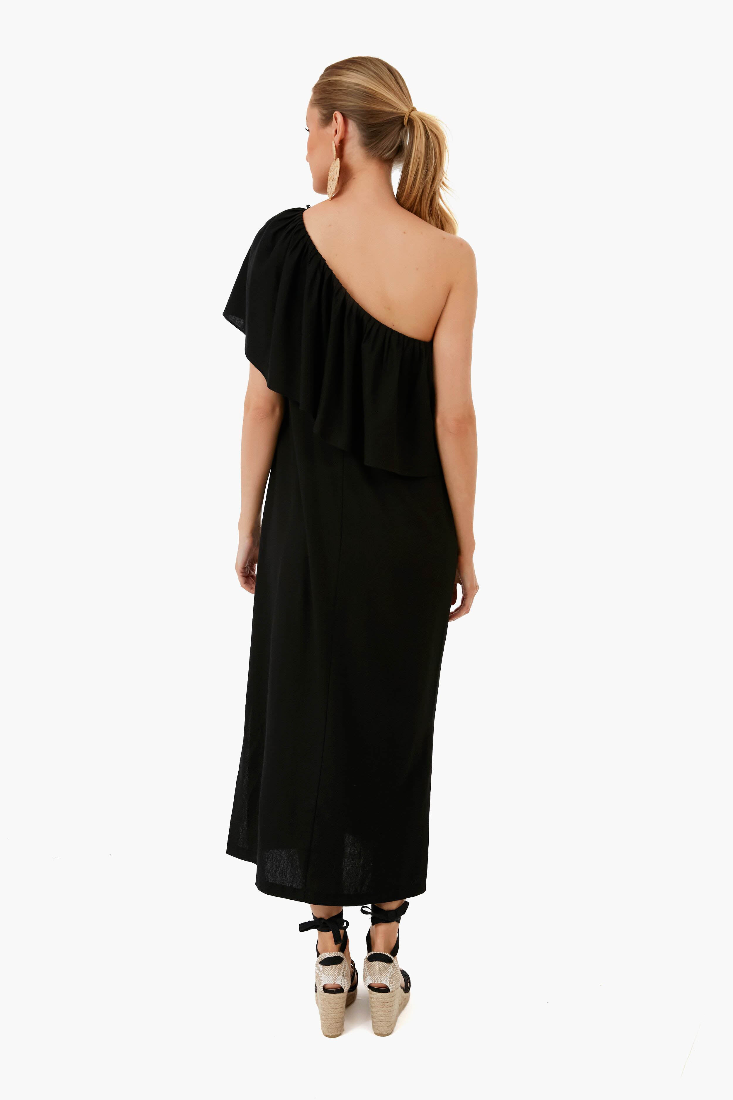 The Florencia Dress features an always chic black hue with a one-shoulder ruffle detail. Fun and flirty. this linen blend dress has a breezy silhouette. perfect for dancing the night away. Pair with statement earring and gold shoes for a chic date night look.