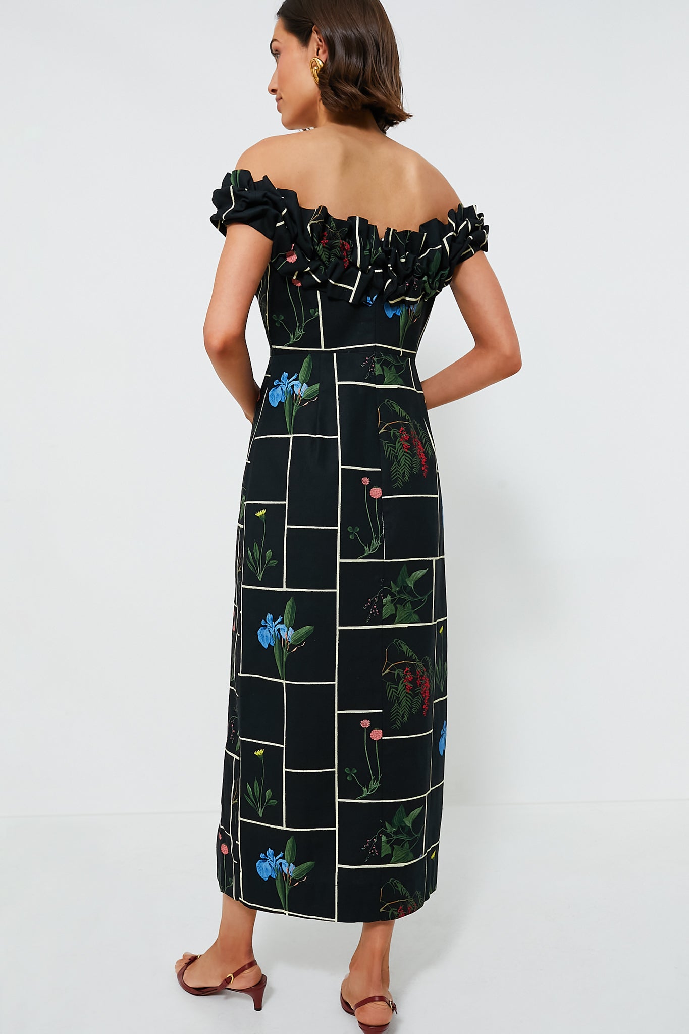The Black Fresher Buds Suze Dress is an exquisite style that is perfect for elevated occasions. With an off-the-shoulder neckline with magnificently textured gathering. a slim column silhouette. and a Victorian-inspired fabric. this look is graceful and elegant while still being modern. Pair with heels and a gold necklace or simple ballet flats for a feminine look that will be the belle of the ball.