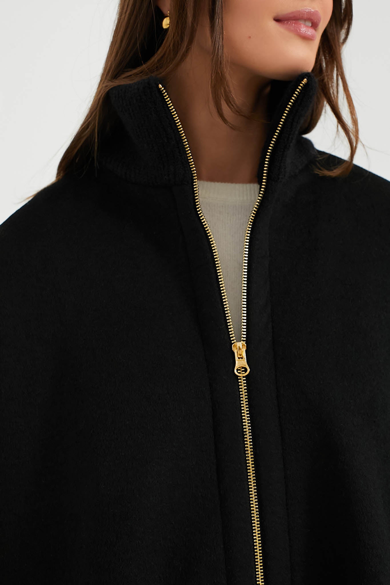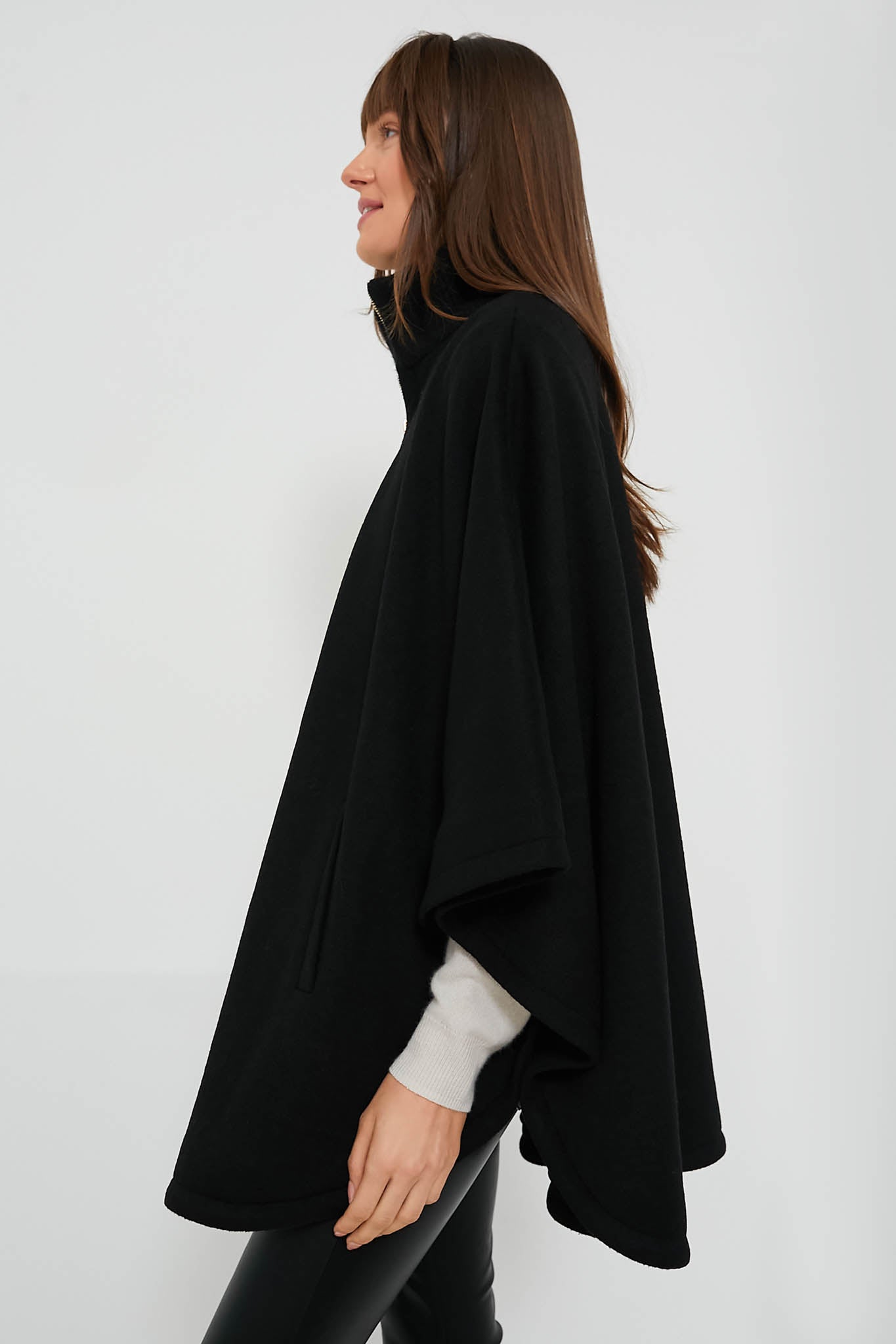 The Black Full Zip Huntington Cape is a closet must-have for the cold-weather months. The oversized silhouette makes this the perfect layering piece. and the zip closure allows this to be worn on its own or over a button-down. With a wool blend. you are sure to be comfy and cozy in this stylish look- pair with denim and loafers or with a dress and boots for an absolutely elegant outfit.