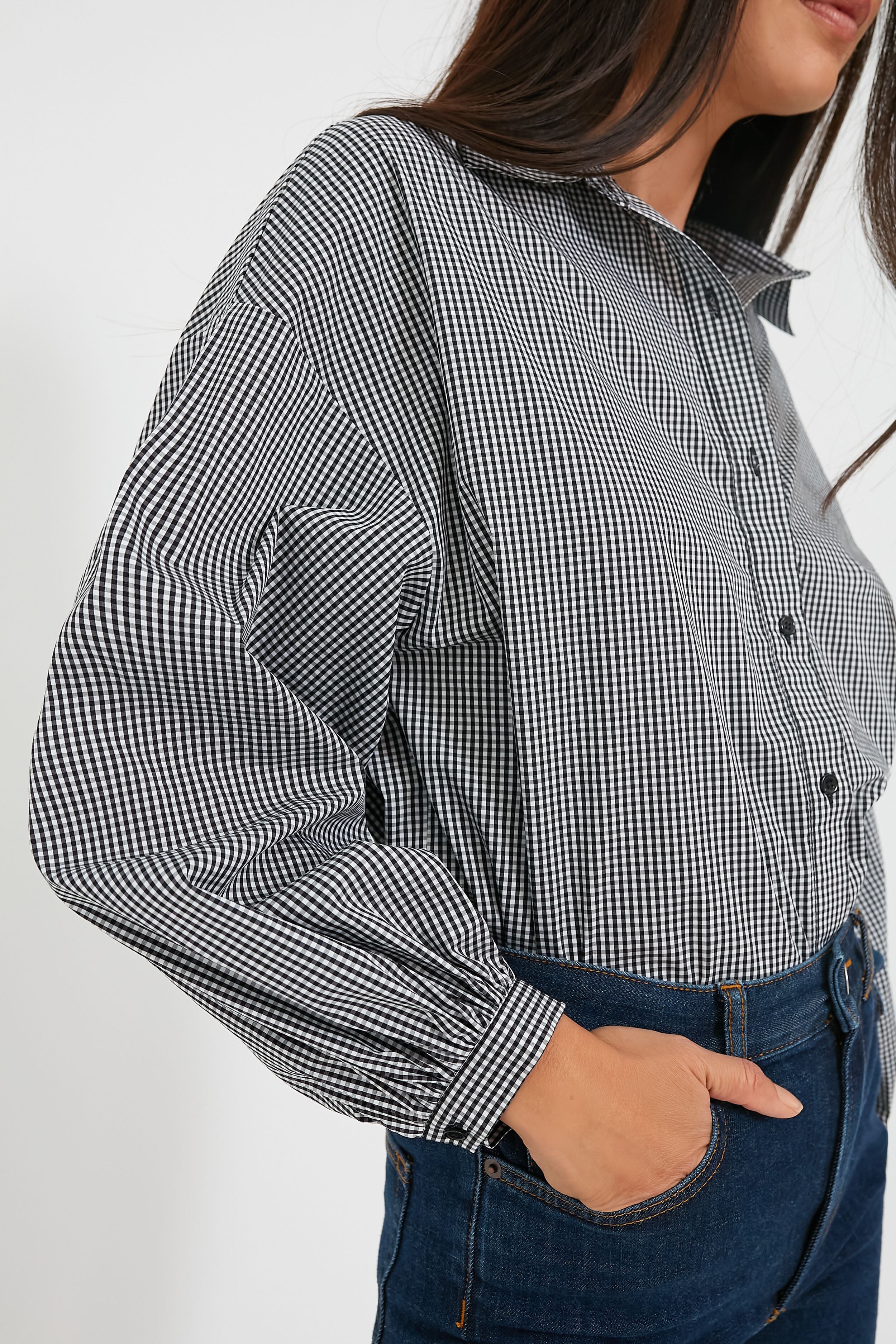 When you want a classic look but crave a bit of creativity in your styling. the Black Gingham Spencer Shirt is the way to go. The brand's best-selling fit. updated with a set of voluminous blouson sleeves and a charming neutral checked print. this silhouette is a surefire way to add some freshness to your outfit rotation. Perfectly versatile. this button down looks ultra-chic when paired with a mini skirt. wide leg denim. or slim trousers!
