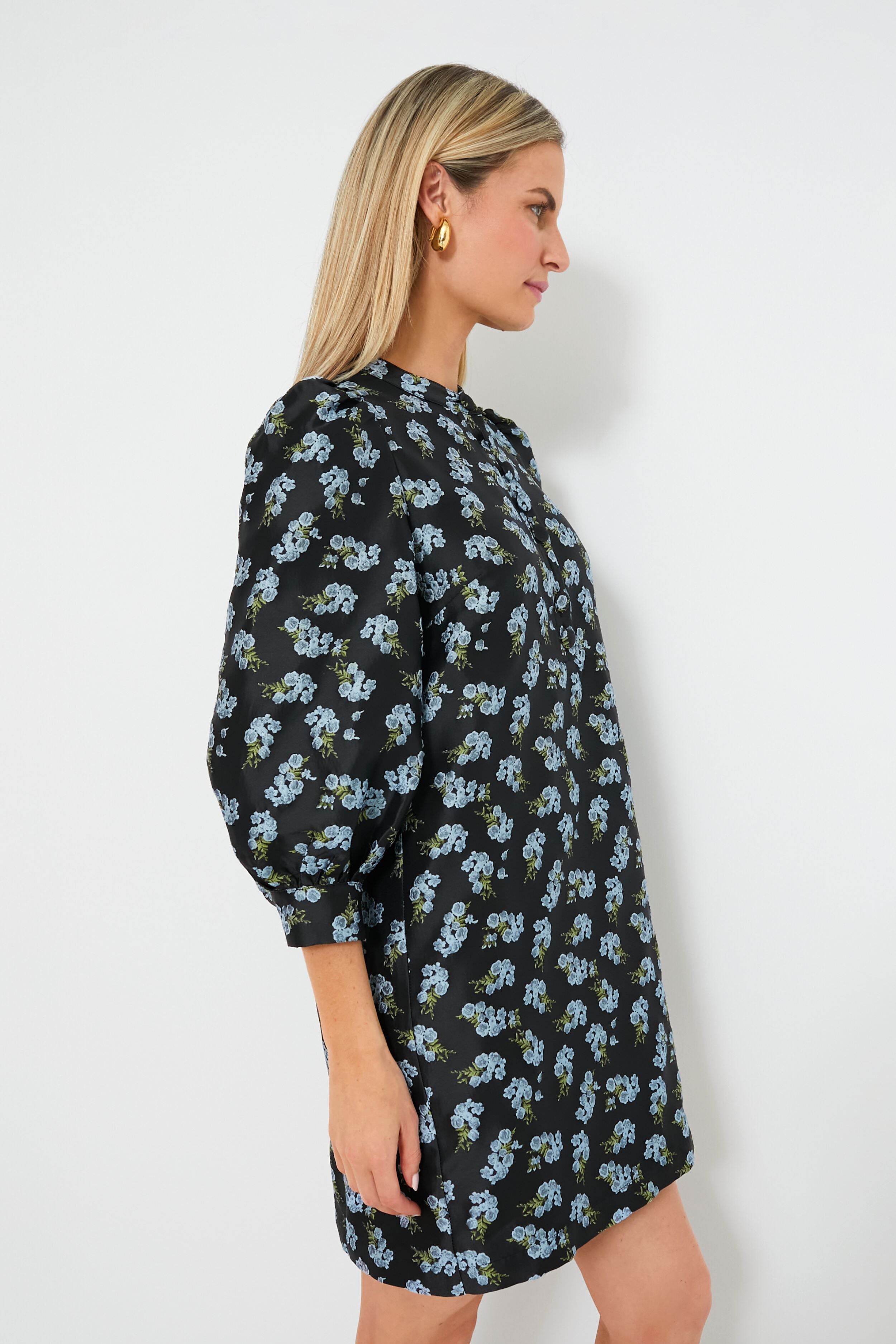An elegantly feminine number. the Black Heirloom Jacquard Samantha Dress boasts half-length balloons sleeves. a front button placket with self-covered buttons. and a structured shift silhouette that can be styled for any occasion. Pair with black heels and and gold hoops. or with baby blue accessories to complement the graceful floral design!