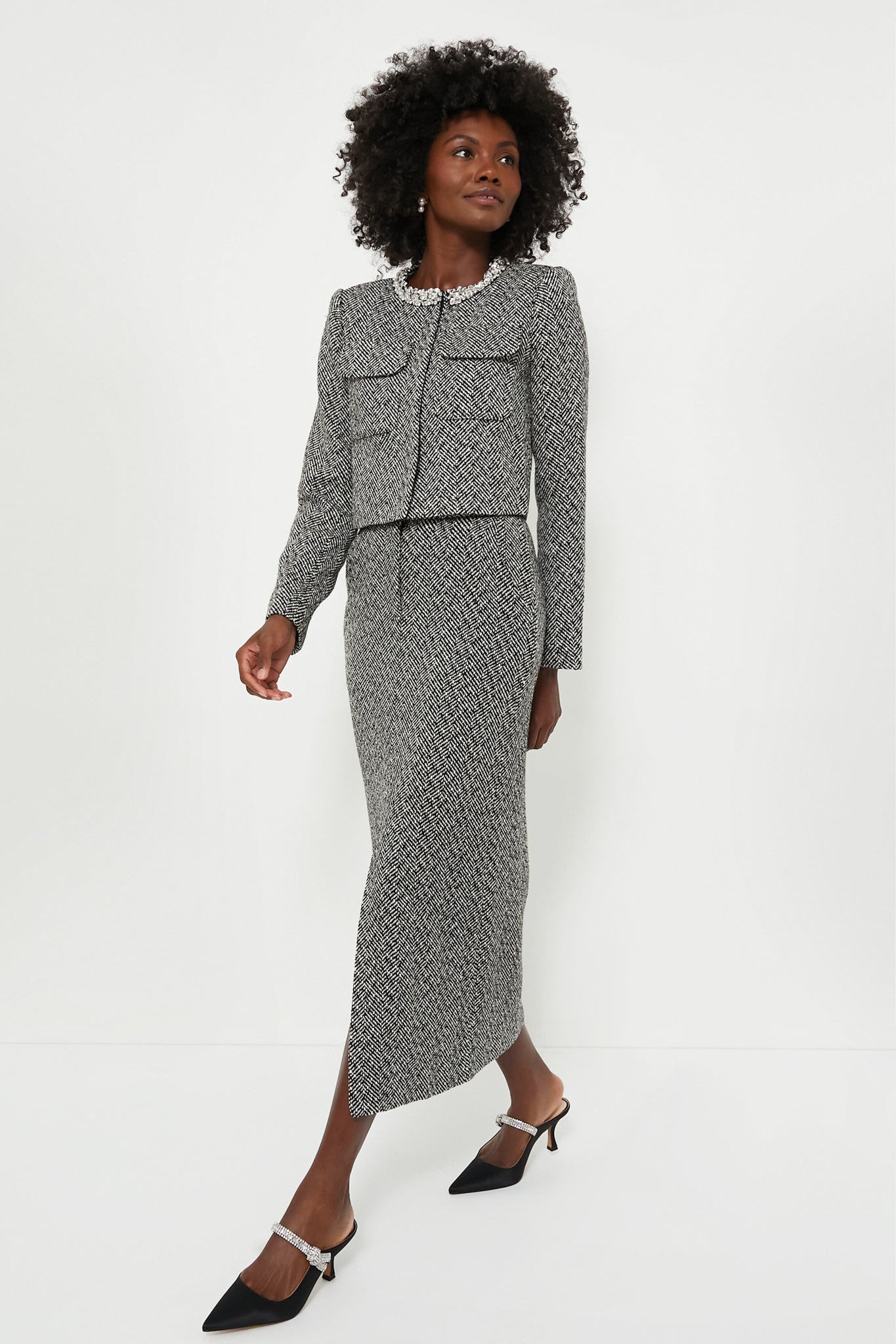 Feel preppy and put together in the Black Herringbone Midi Skirt. Featuring a high rise waistband. knee length center slit. and herringbone pattern. this number will make you feel like the ultimate boss at your next meeting. Style with the Black Herringbone Embellished Jacket as a matching set for the perfect power suit or with a neutral blouse and black heels for a desk to drinks look.