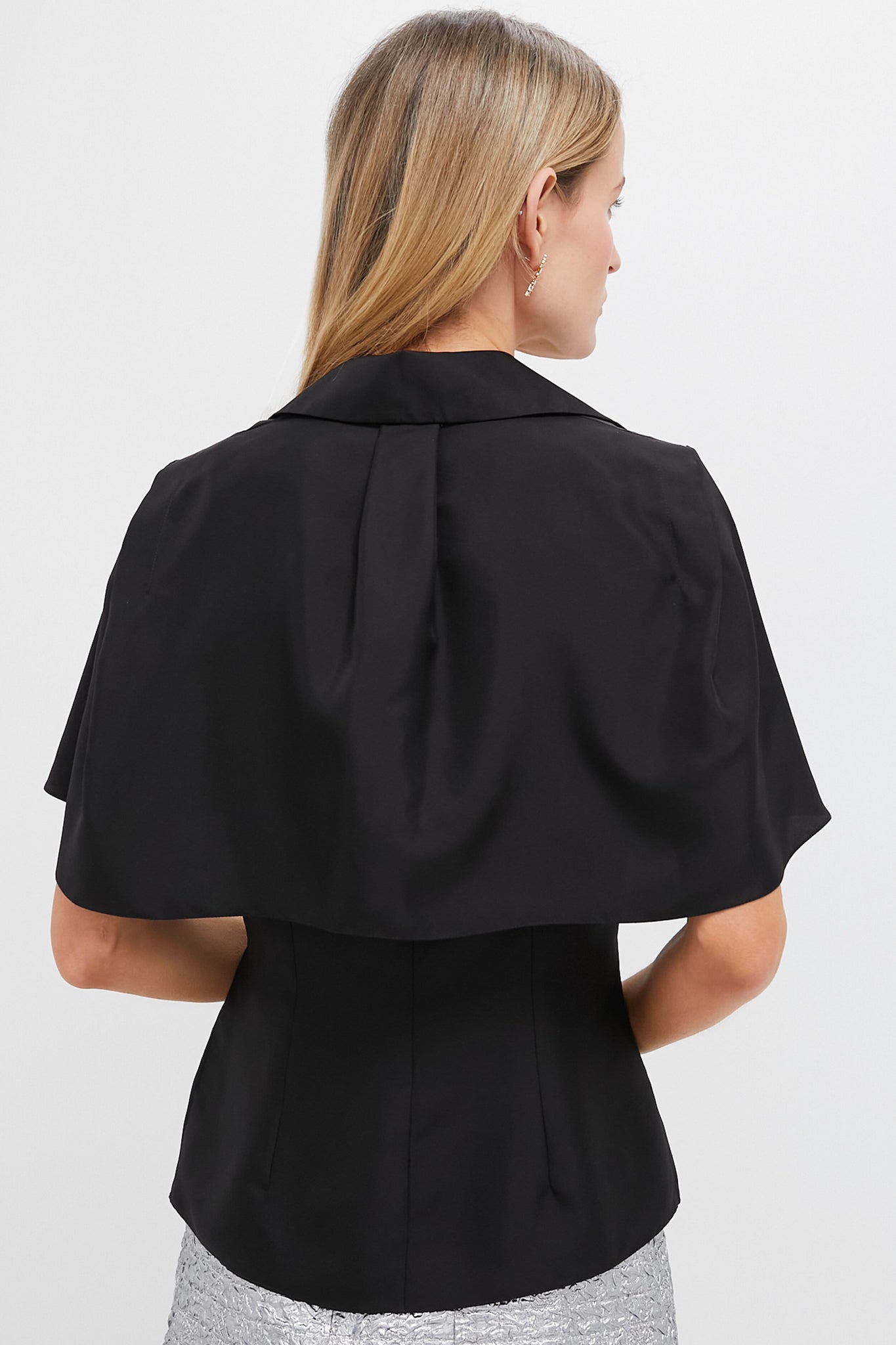 The Keiko Silk Twill Top embodies luxury and elegance. Crafted from soft silk twill. it features a sleek cape feature and a relaxed silhouette for modern versatility. With its timeless black hue. this top transitions effortlessly from formal occasions to off-duty elegance. combining classic charm with contemporary style. We paired it with the Silver Metallic Seersucker Kensie Skirt. a clutch. and black heels.