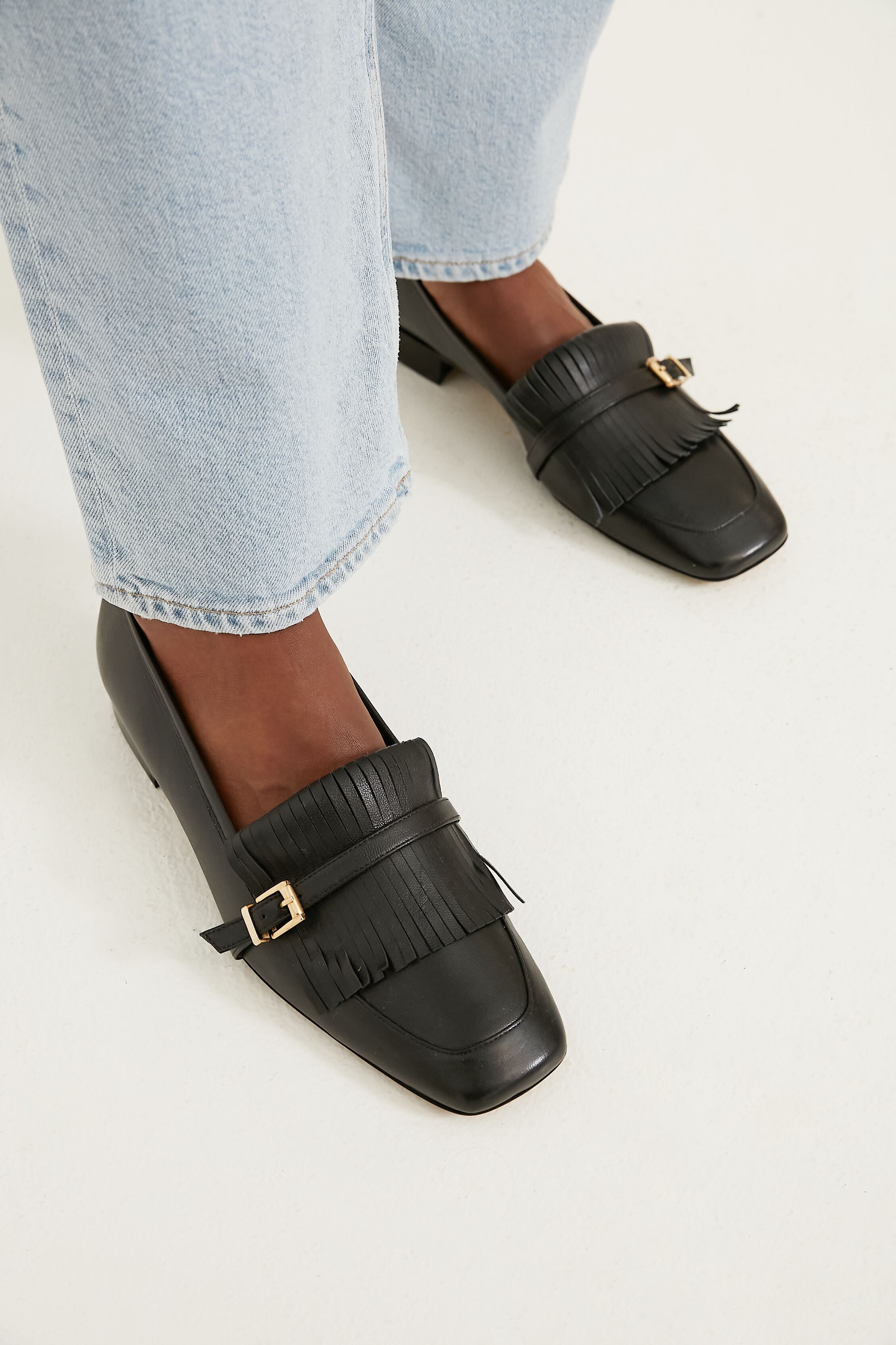 An update to the classic loafer. but with more flair and personality. meet the Black Kiltie Loafer. Timeless details are not forgotten here. fringe accents are completed with a small gold buckle strap and a square toe for a classic silhouette that'll live in your closet for years to come. With a slight heel to add a dash of formality and a sleek black leather finish. these chic stunners are perfect for desk to drinks. just add a fun skirt and a statement bag.