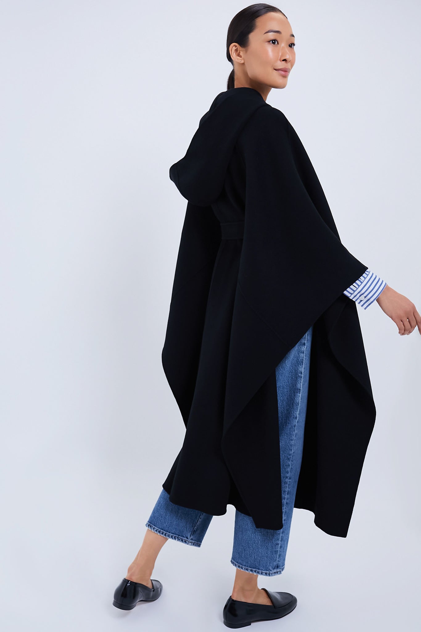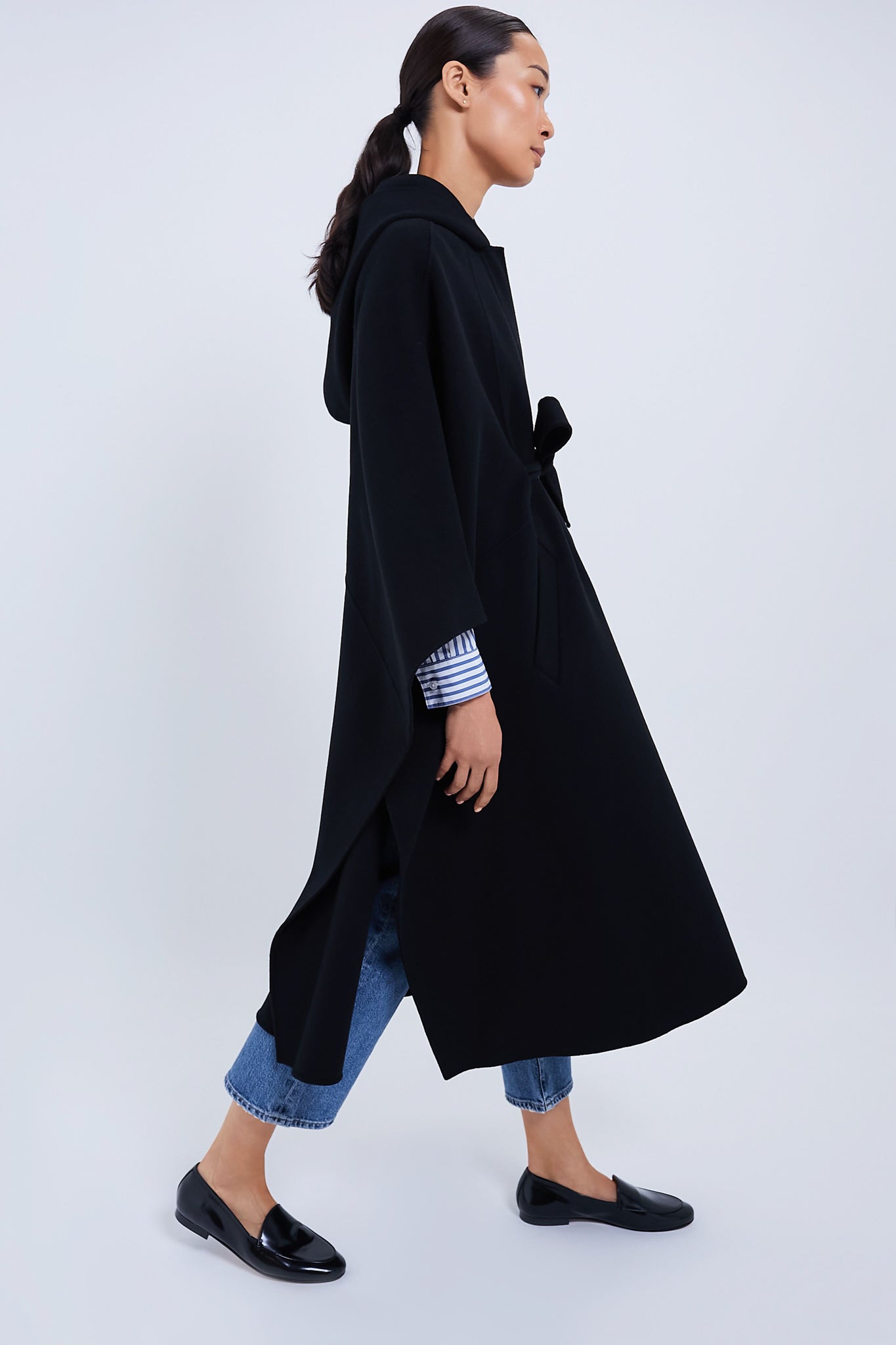 Offering a fluid drape that provides a cozy layer for maximum comfort in mild climates. a non-removable hood offering extra shelter from the wind while the sash belt can be cinched for a more defined silhouette and to keep warm on colder days. Layered over anything from dresses to trousers. this style can do it all and look fabulous the whole time.