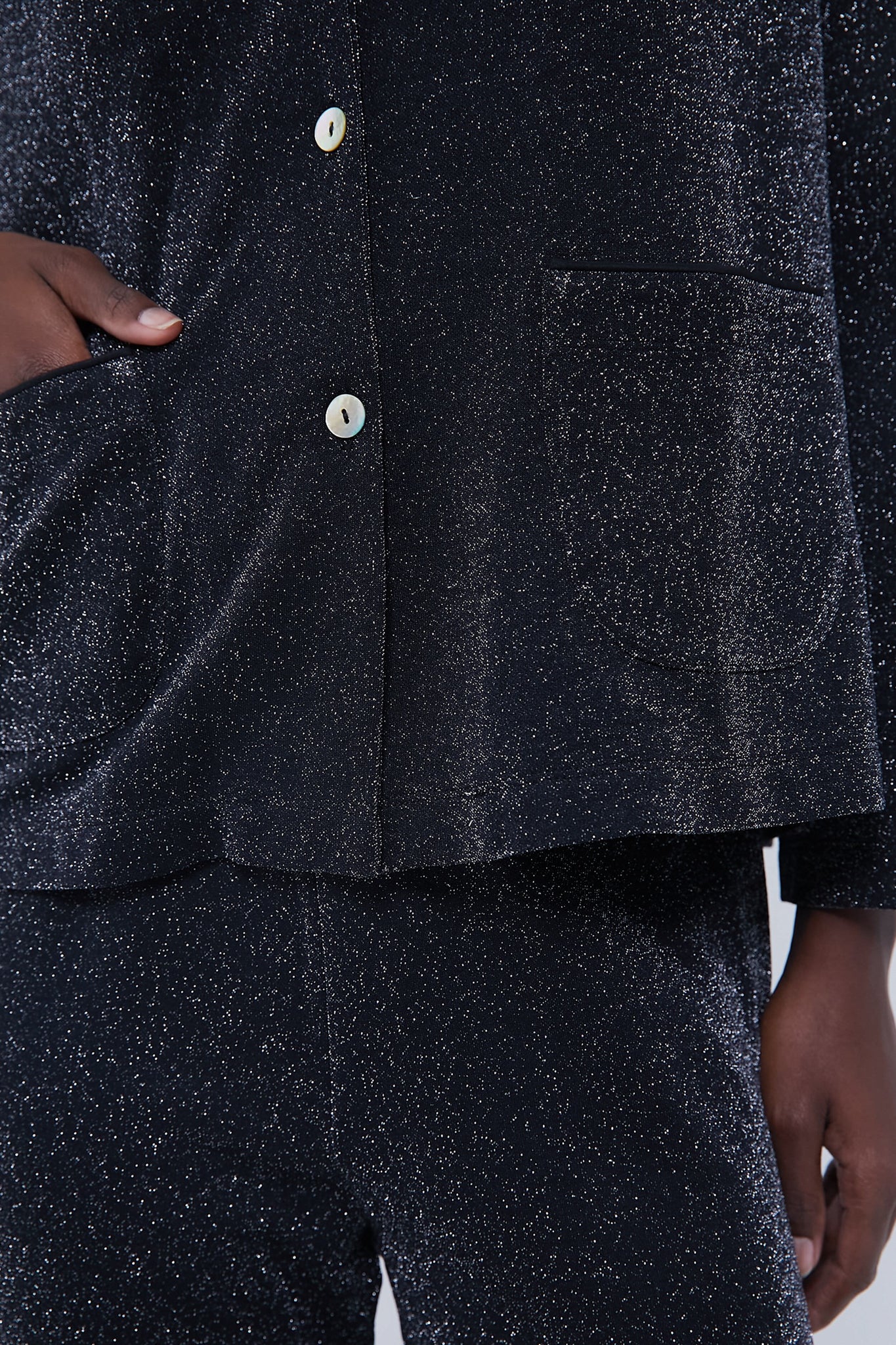 This chic matching set boasts a front button placket. and a comfortable elastic waistband. With a shimmering fabric. these are designed for dancing or dreaming- pair with heels and a clutch or your favorite slippers!