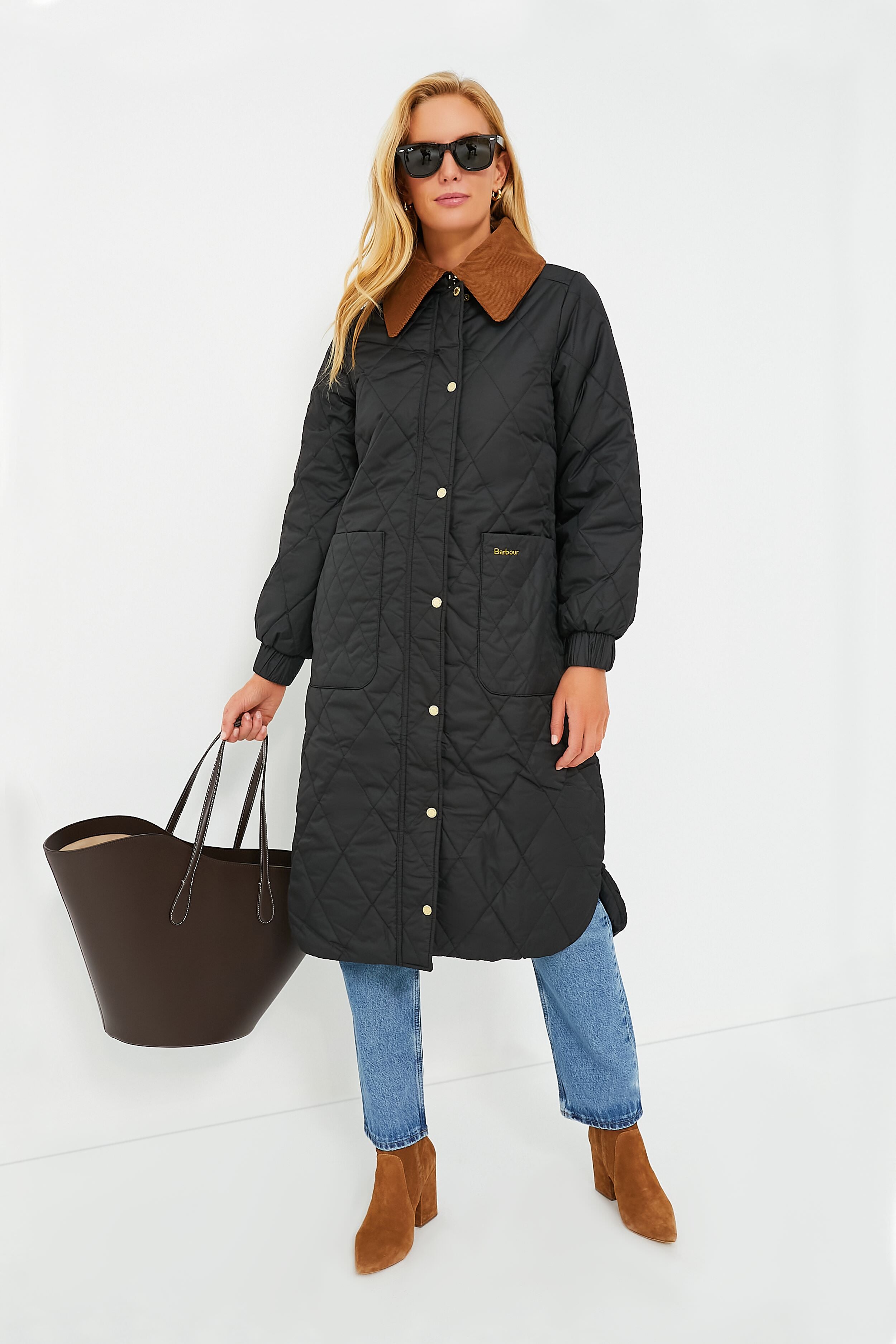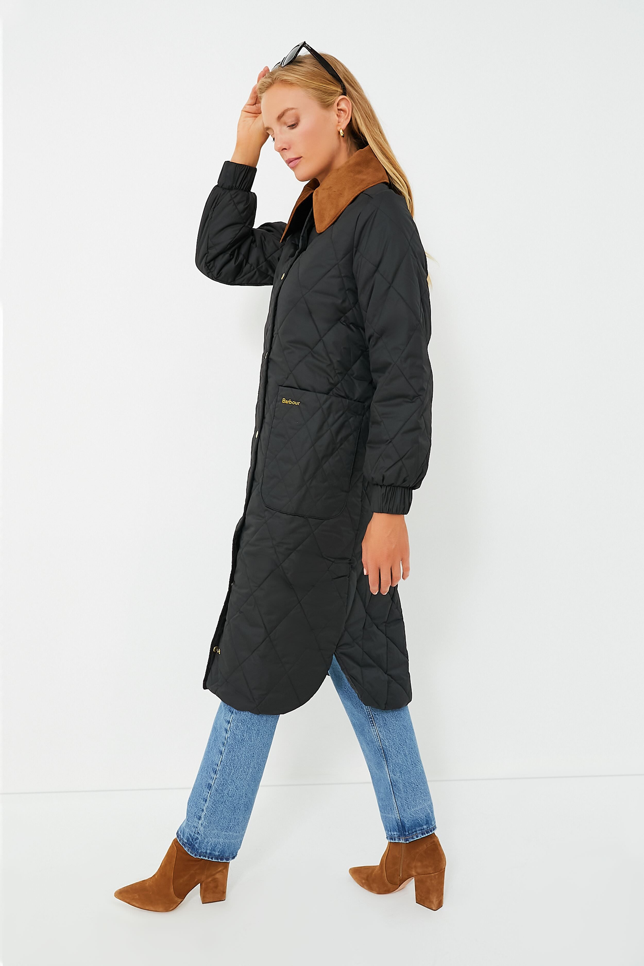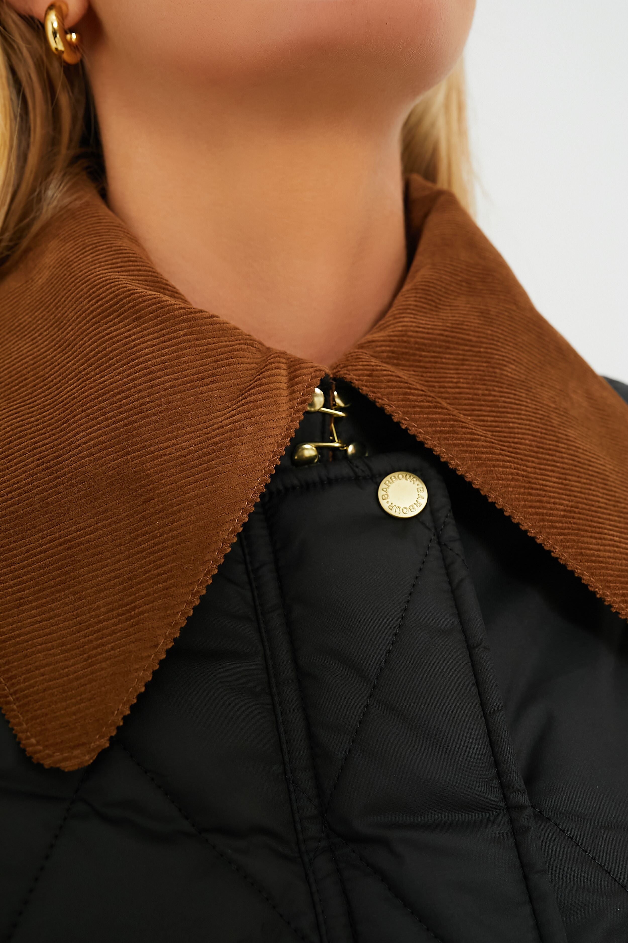 Merging past with present. the Black Marsett Jacket delivers a classic silhouette with modern updates perfect for cold-weather conditions. Featuring all-over diamond quilting with a high-shine finish. this luxurious layer features a statement corduroy collar. patch pockets at the hips. and a longer length sure to keep the chill out. Whether you're commuting to the office or spending time outdoors with the kids. style with a soft sweater. denim. and boots for a look equipped for braving the cold.