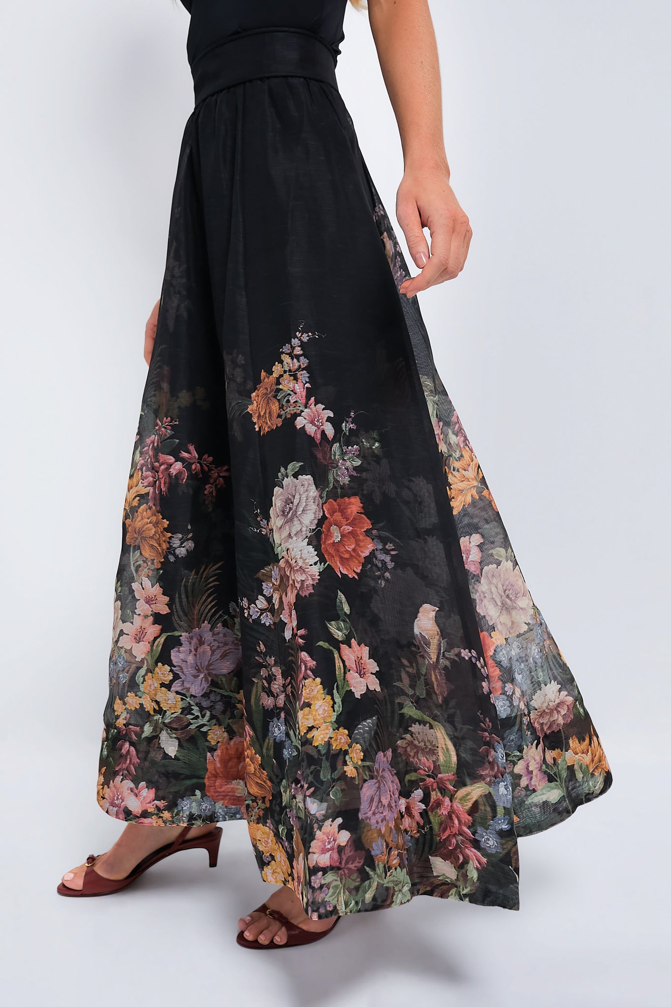Introducing a stunning silk linen organza midi skirt featuring corded piping around the waistband. a full skirt silhouette. and a floral print decorating the hemline. We are styling it with the matching Black Multi Floral Pavilion Tie Neck Blouse and heels for a brilliant set.