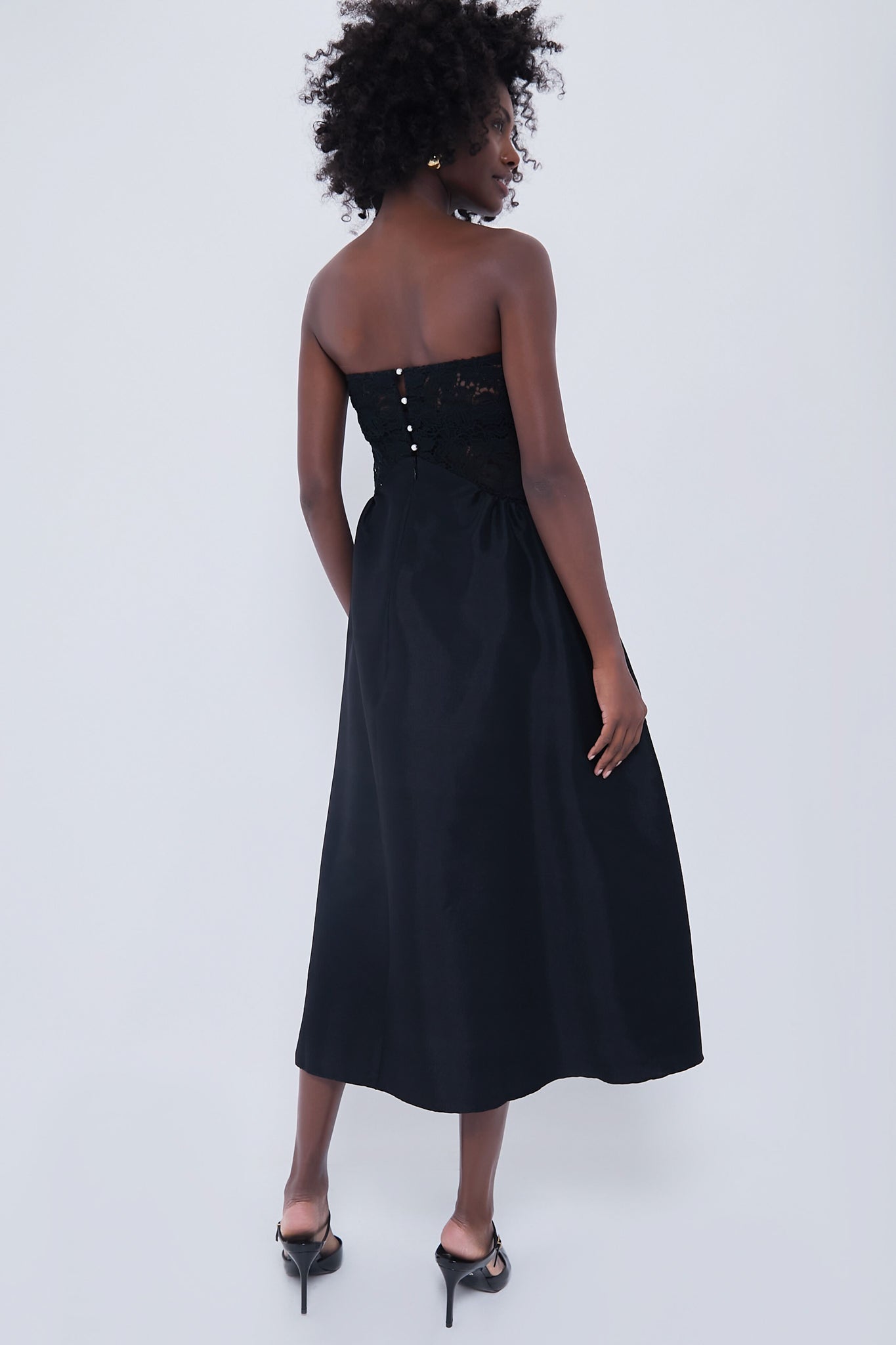 - Back button closure down bodice