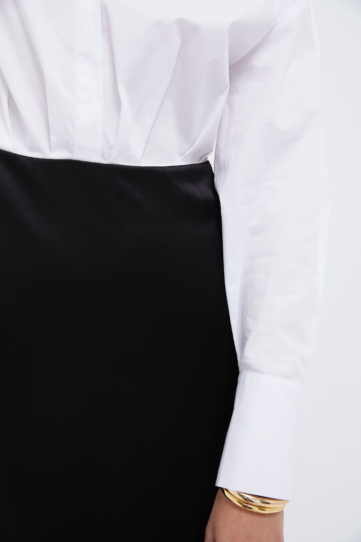 The Nile Dress is a stunning dress for your next black-tie event. This shirtwaist gown features a polished white button down top with a slight flare black skirt. Be as bold as your heart desires with accessories. we chose to stay classic with a gold clutch. jewelry. and black heels. This dress oozes sophistication.