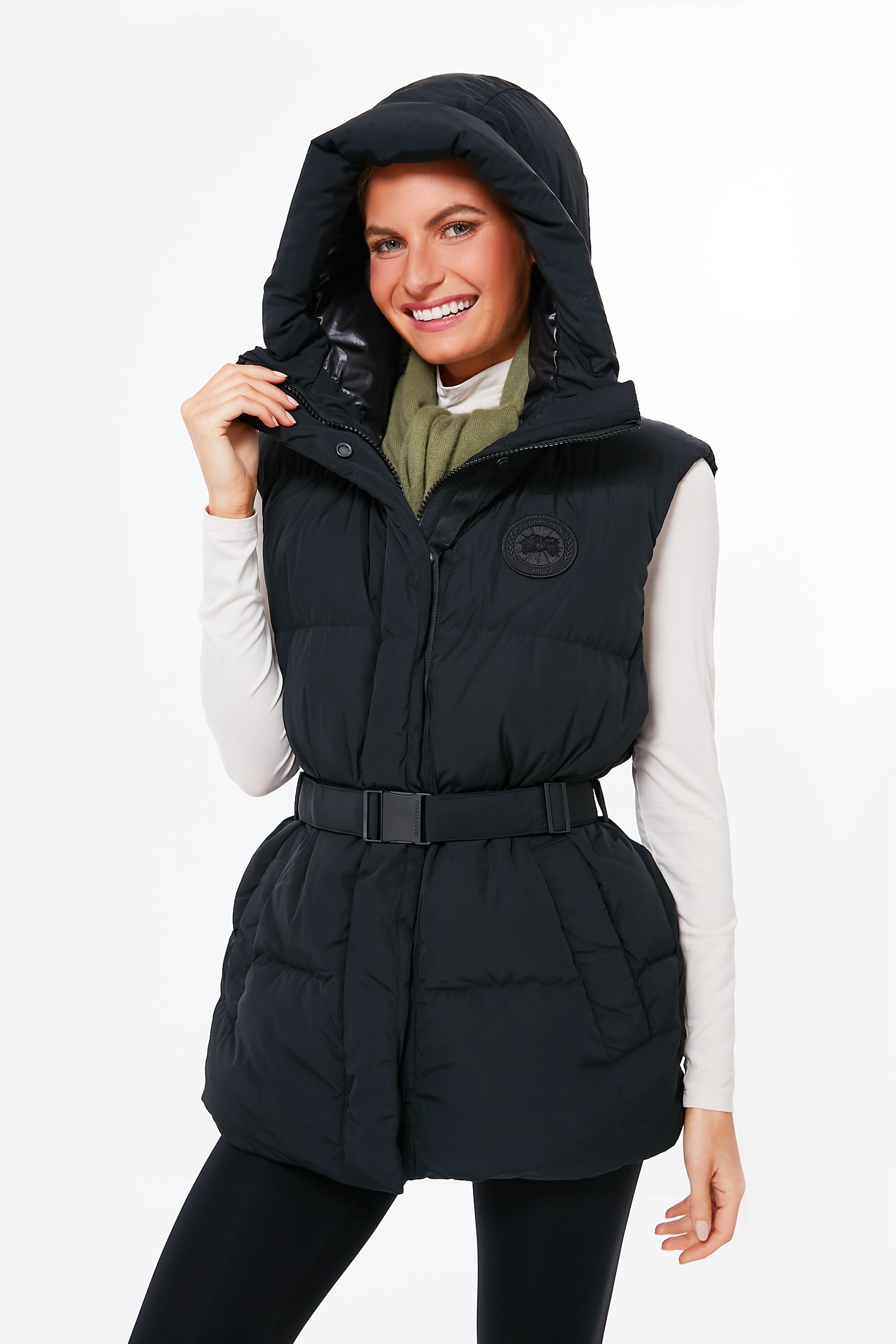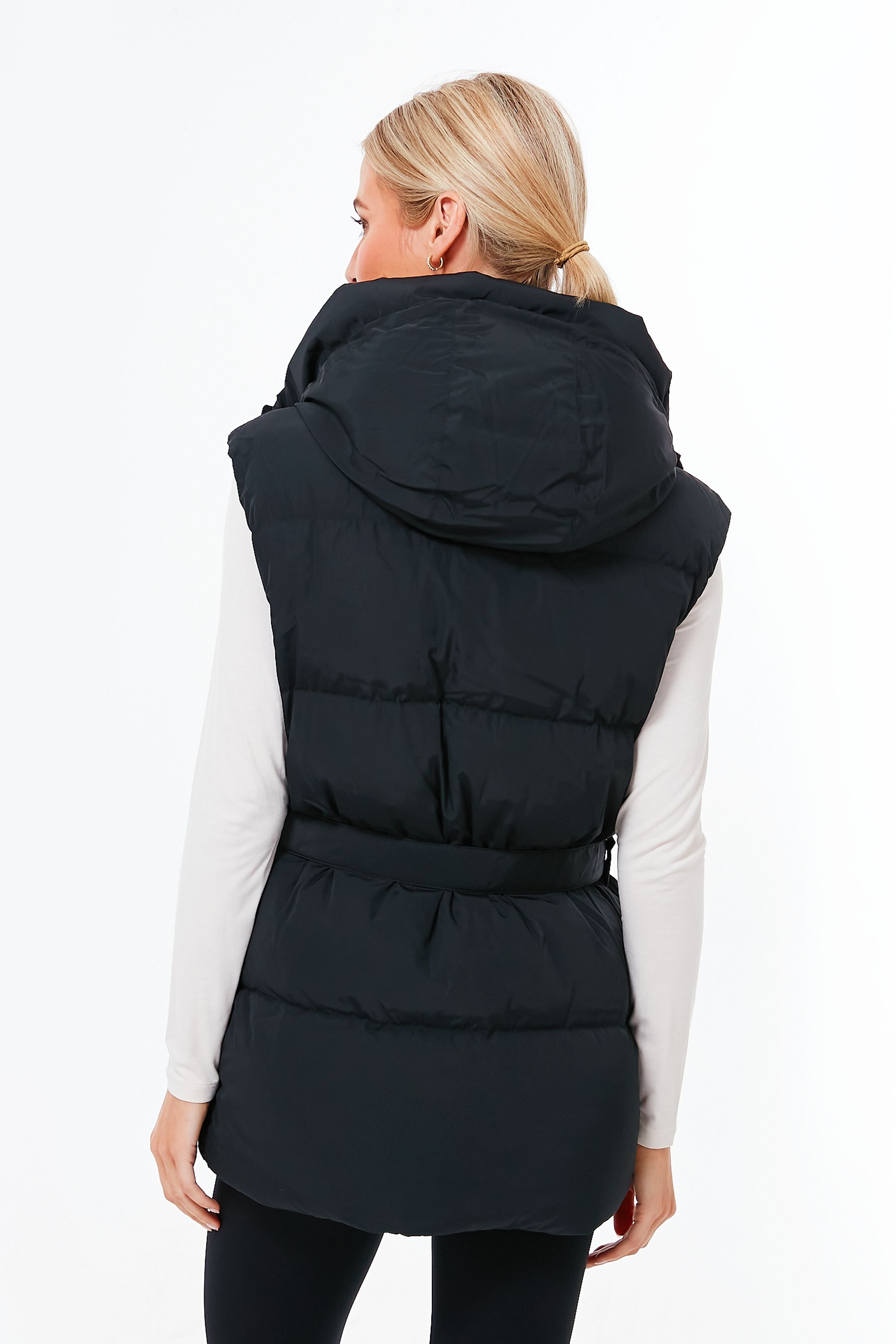 The Black Noir Rayla Vest is a multi-season staple that will keep you warm without feeling stuffy or constricted. Made from a luxe water-repellent fabric with a soft-to-the-touch finish. this transitional silhouette features a drawcord adjustable hood. an elasticated belt with a metal buckle to cinch in the waist. and is packed with cozy down to ensure you never let the weather get you down. Layer over your favorite fleece and add a beanie for a nature walk. or style with a turtleneck and boots to grab a latte from your favorite cafe.