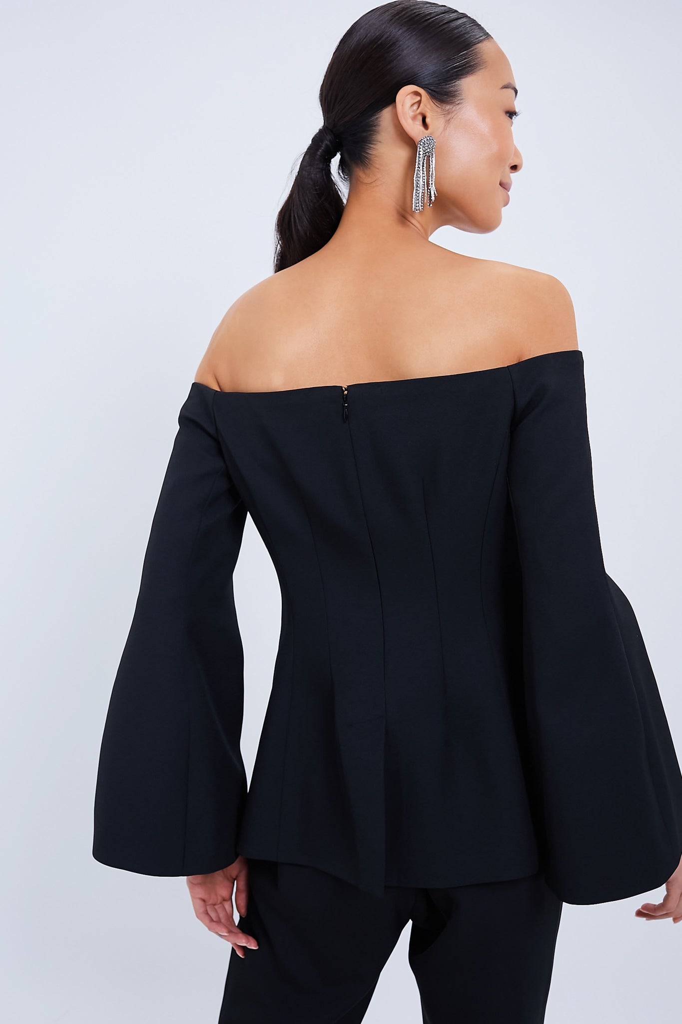 Feel put together and polished for special events in the Black Bria off-the-shoulder blouse. From festive holiday parties to fancy date nights. this off-the-shoulder blouse was designed to stand out for special occasions and year-round wear. Simple yet chic. this flattering silhouette transitions easily from day to night. and can be worn in any climate. Decorated with covered buttons. long bell sleeves. and faux pocket details. this timeless top is one you'll reach for whenever dressing up is a requirement.