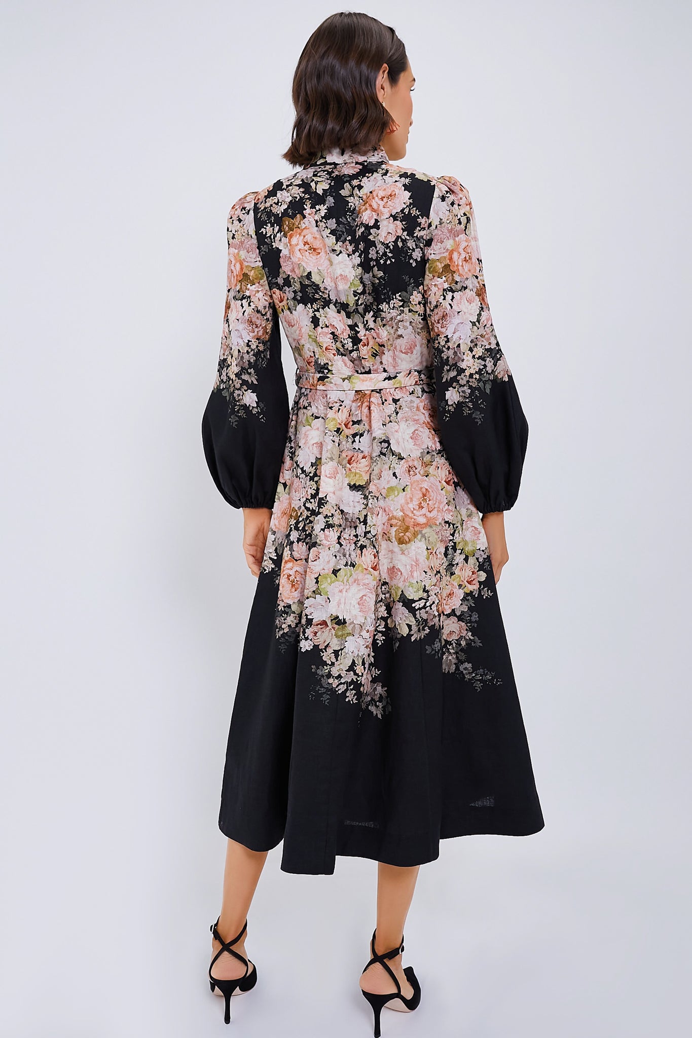 The Black Rococo Floral Illustration Buttoned Dress is a stunning midi boasting elegant details such as the long blouson sleeves. stand collar. and front rouleau button loops. Perfect for any formal occasion. we are pairing these with classic black heels and a clutch for a show-stopping ensemble.