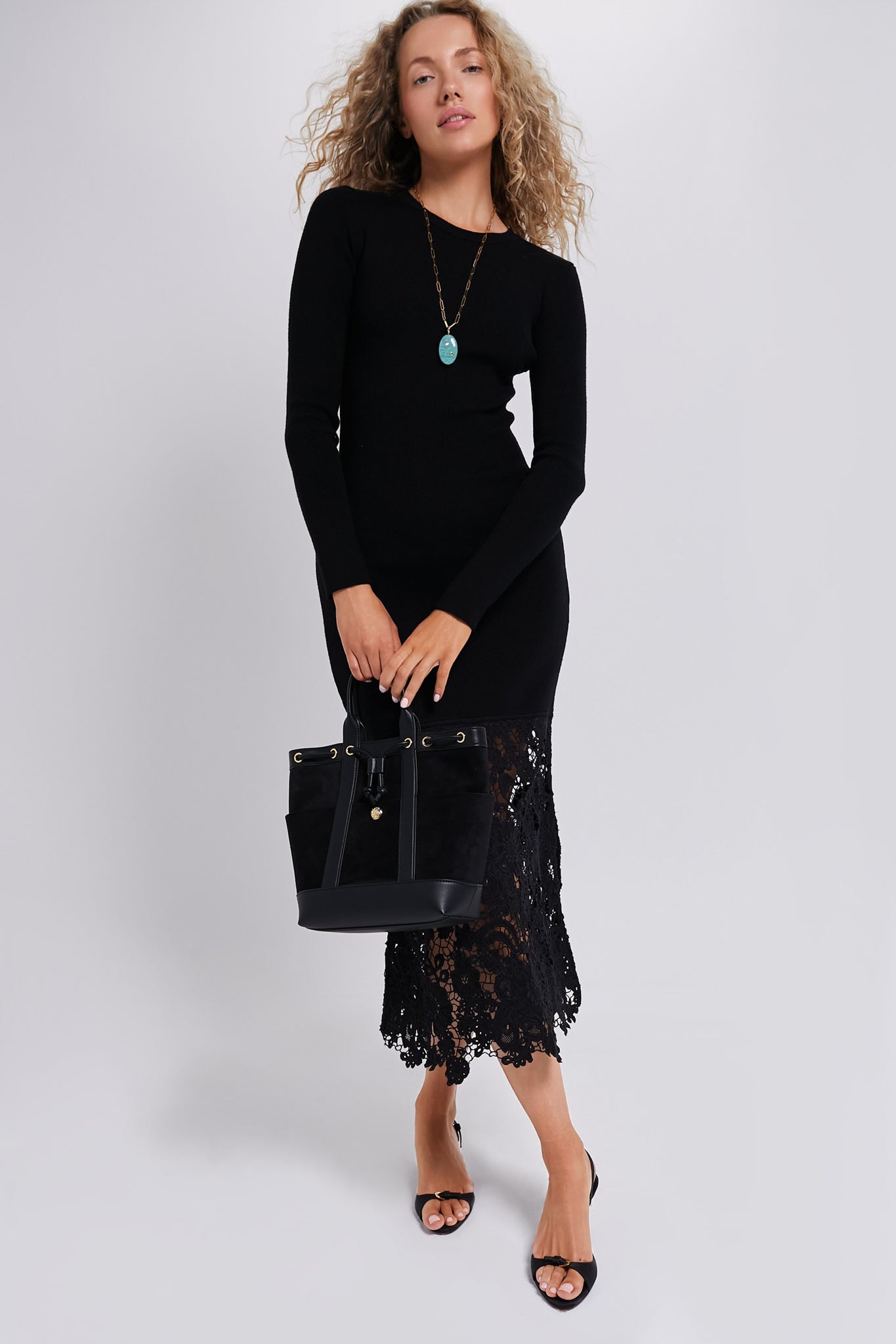 We love the Sabine Combo Dress for its comfortable. form-fitting wool bodice and sheer lace applique skirt. The drop waist creates a striking silhouette that instantly elevates the look. Pair with heels and statement earrings for a timeless. elegant ensemble.