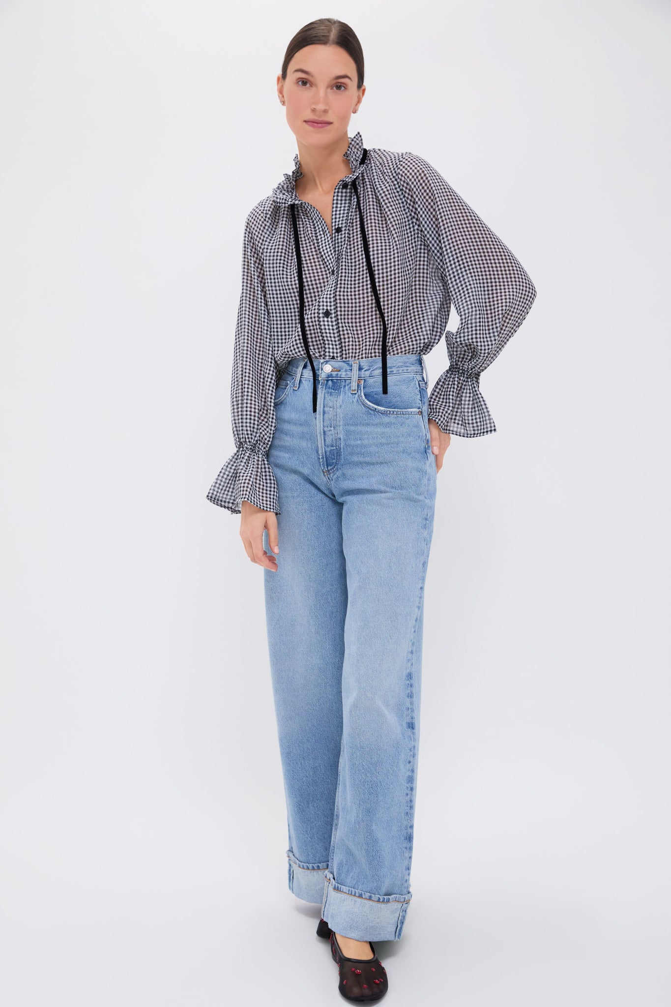 The Black Sheer Fluid Check Tie String Shirt features a high ruffle collar with a black tie detail at the neckline. With buttons up the front. long balloon sleeves. and a gathered cuff. this shirt is perfectly paired with jeans. ballet flats. and your go to bag!