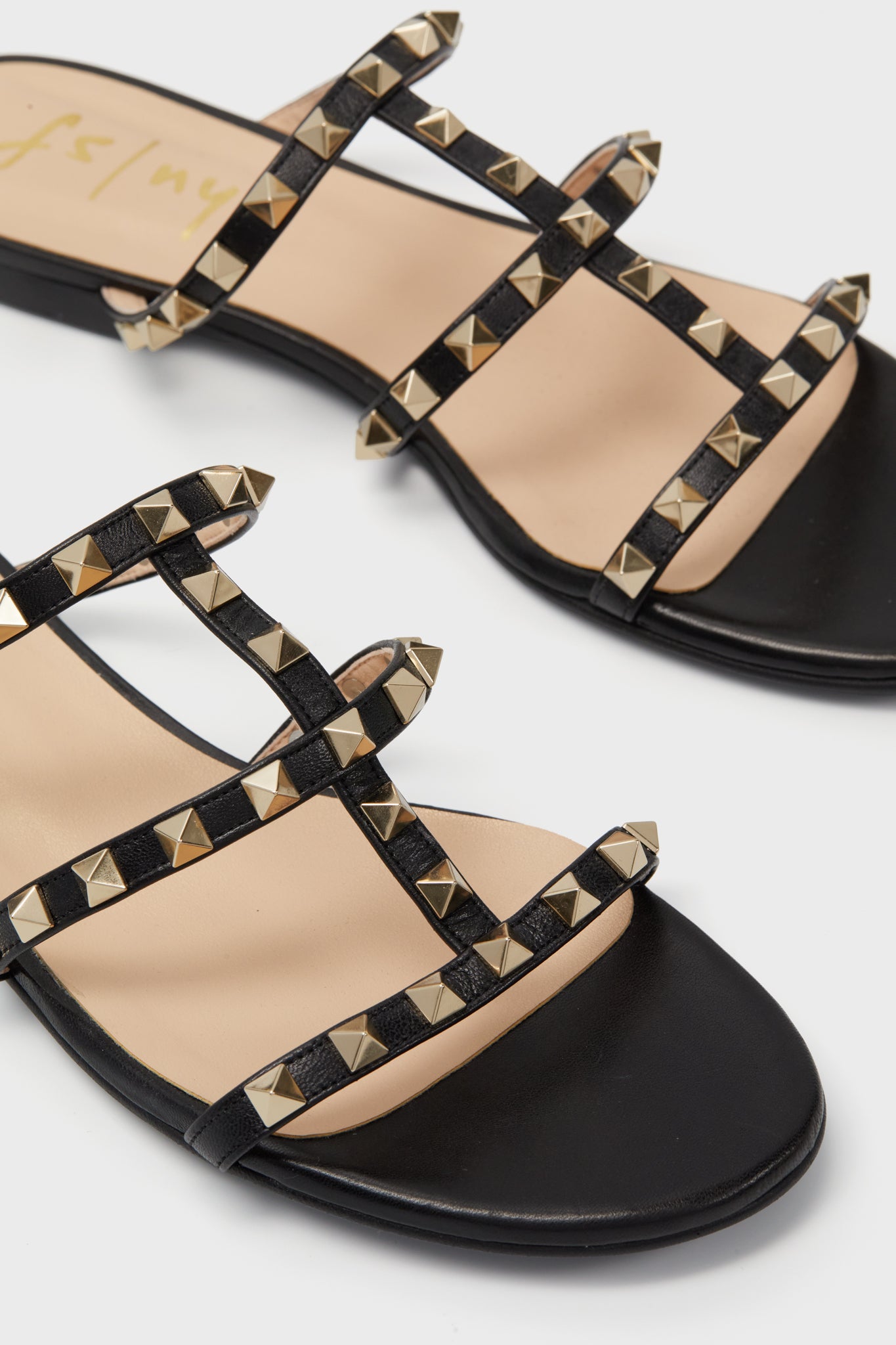 Featuring gold studded detailing and an open toe. the Siel Sandals will be your go-to shoe. Updated in a classic black. there are endless stying options for these shoes. From desk to drinks. day to night. denim to minis. these are effortlessly chic and comfortable.