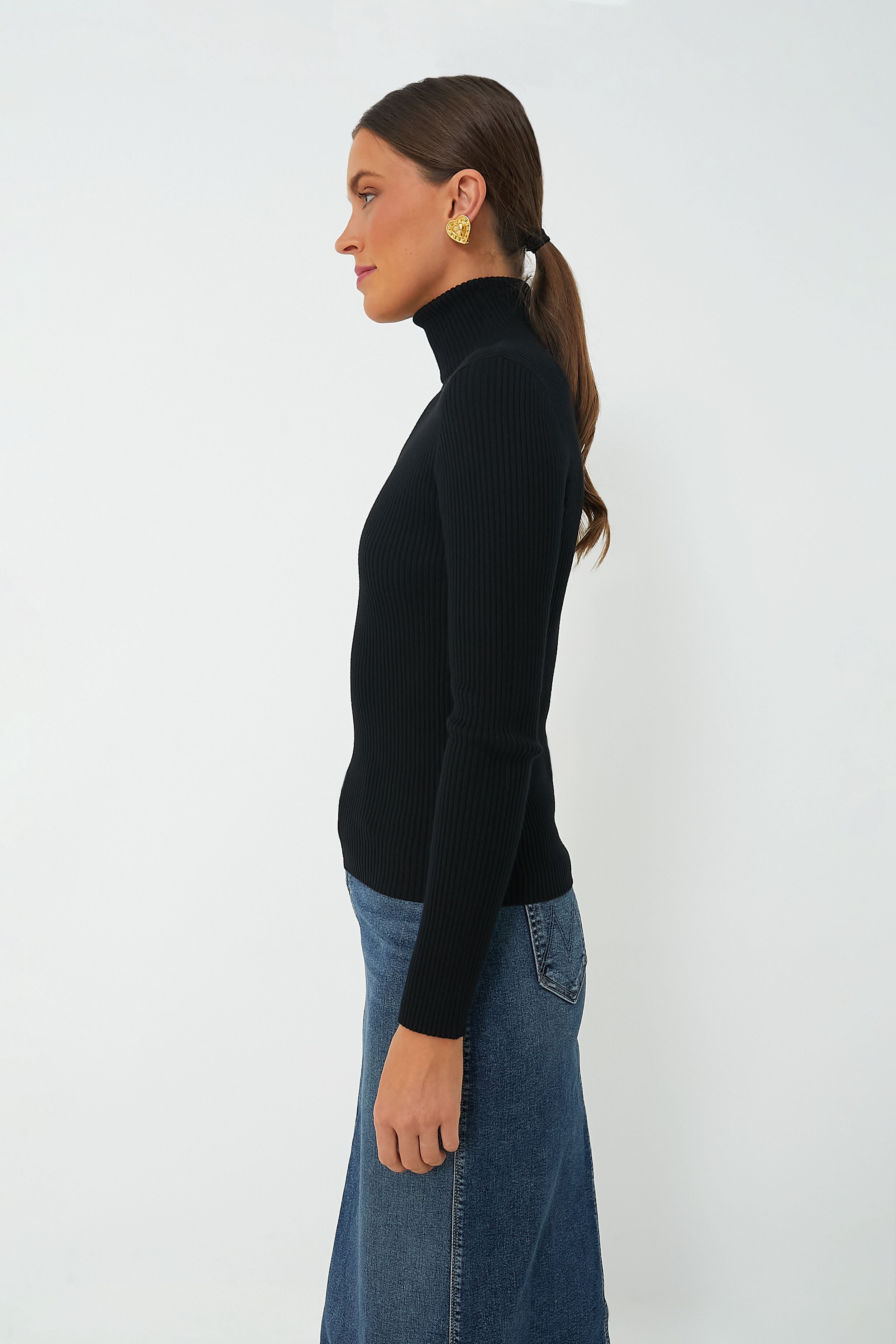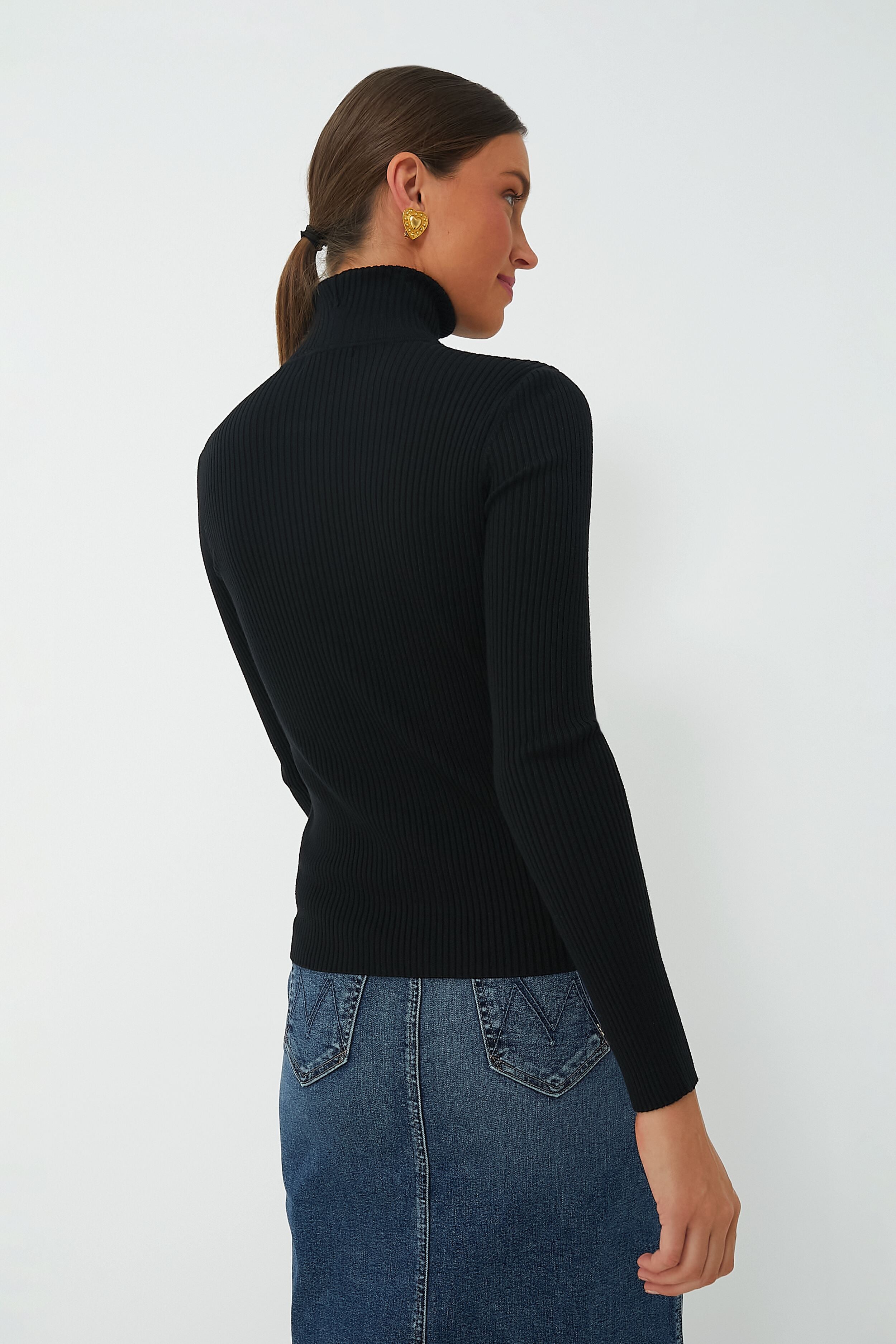 The Black Sonia Turtleneck is just the elevated staple your closet needs this season. Beautifully crafted in a fine ribbed knit. this layering piece pairs perfectly with just about everything! A slim-fitting silhouette. this easy style is simple yet refined and great for day to night wear. We love to tuck it into chic denim and add some cool outerwear over top. or to dress it up with a skirt and statement earrings for a night out on the town.