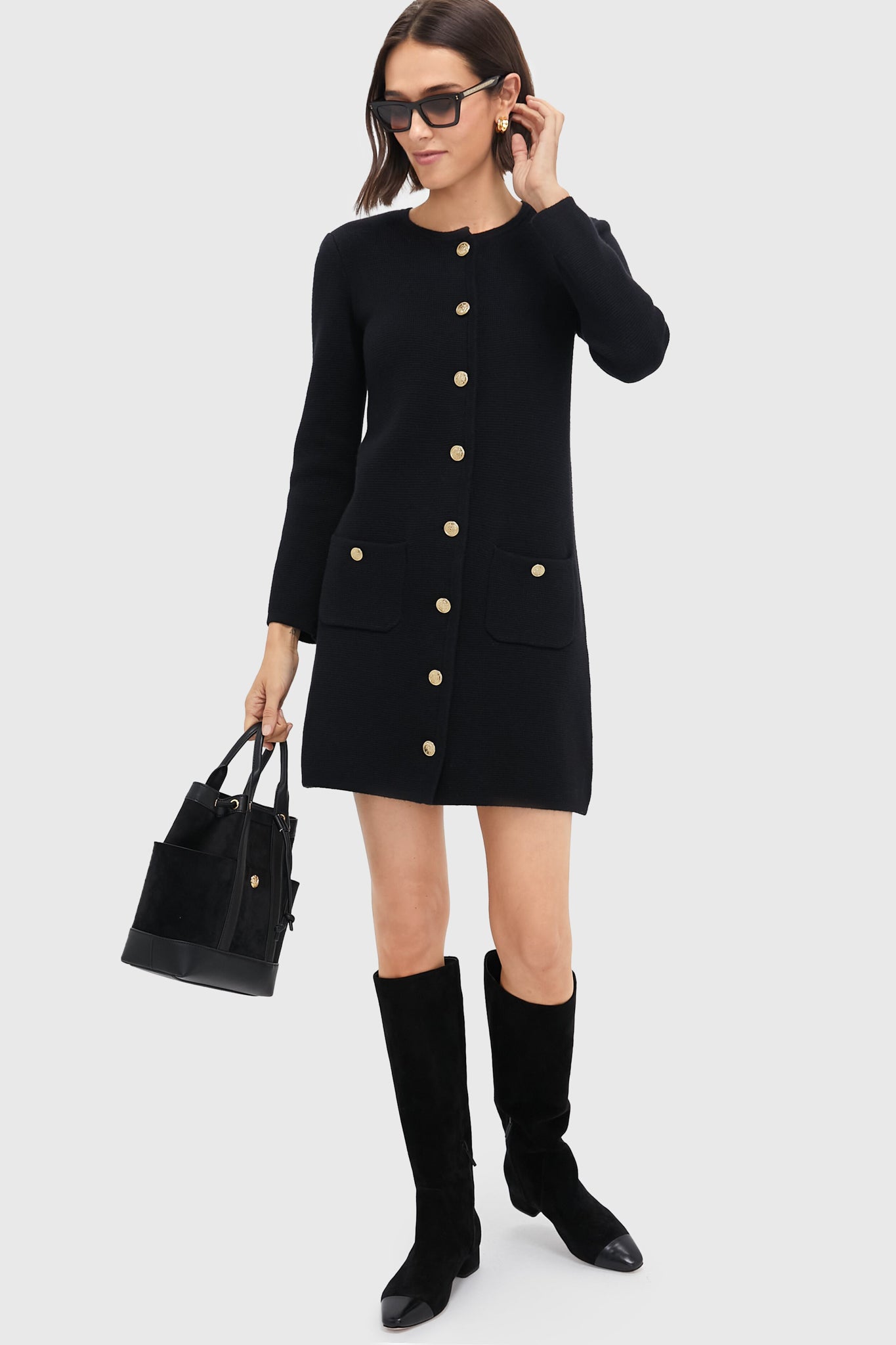 The Stella Cardigan Dress is a versatile and stylish piece. inspired by the classic lady jacket. Its comfortable fit and elegant design make it perfect for casual and dressy occasions. We recommend styling it with a black bucket bag and black boots for day or heels and a clutch for play!