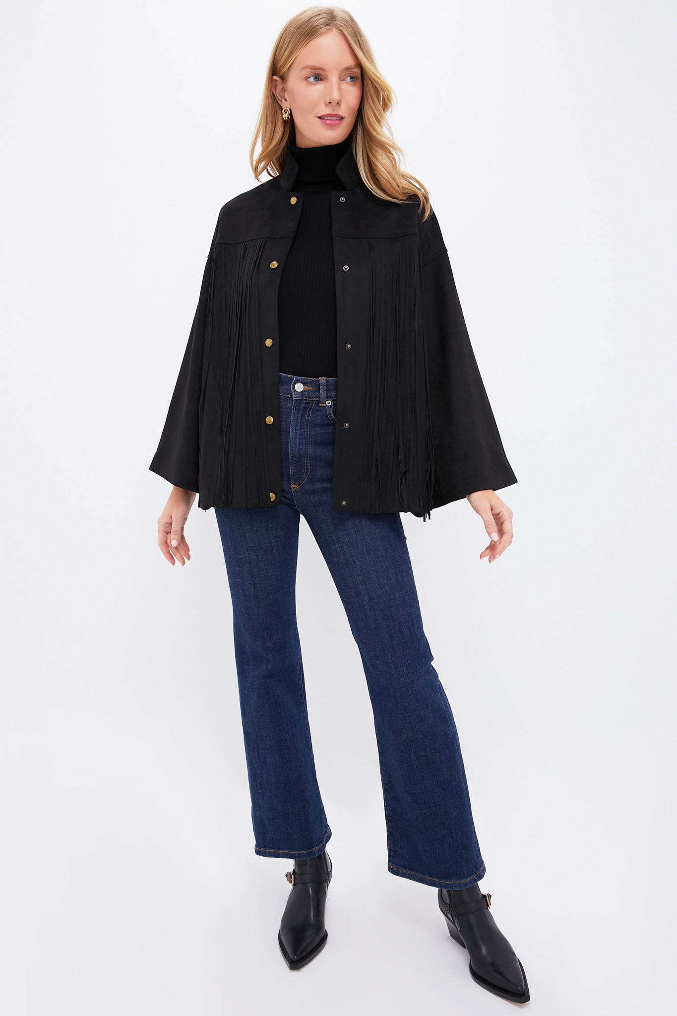The Black Suede Fringe Marant Shirt Jacket boats a playful swinging fringe trim on the front that we just can't get enough of. With a high collar. snap buttons and a relaxed fit. this minimalist and luxurious layer pairs nicely with denim. boots. and a tote for an always-chic look.