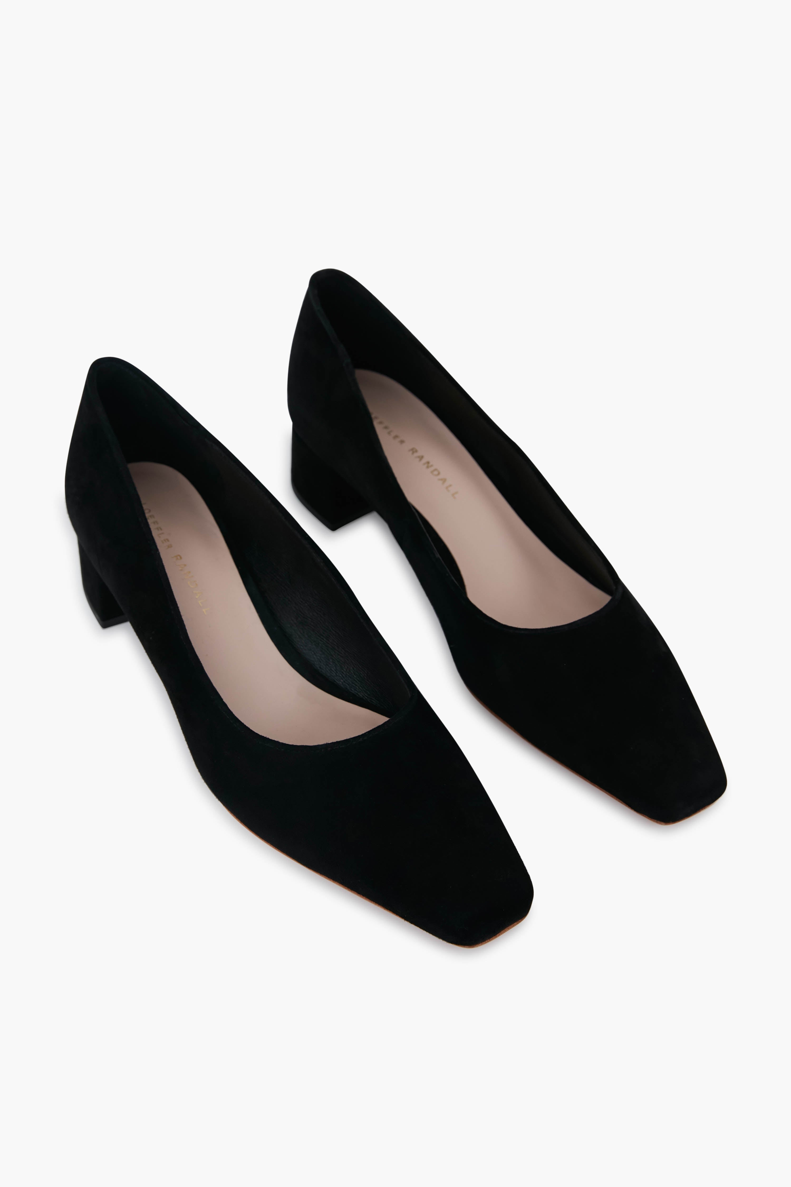 The Suede Nerine Heels in black kid suede feature a padded footbed. square toe. and slip-on construction for ultimate comfort without sacrificing style. These shoes are perfect for desk to drinks. or when your outfit just needs a classic twist. We are wearing these with denim and a staple top for the office and swapping for a bold blouse for margs with friends.