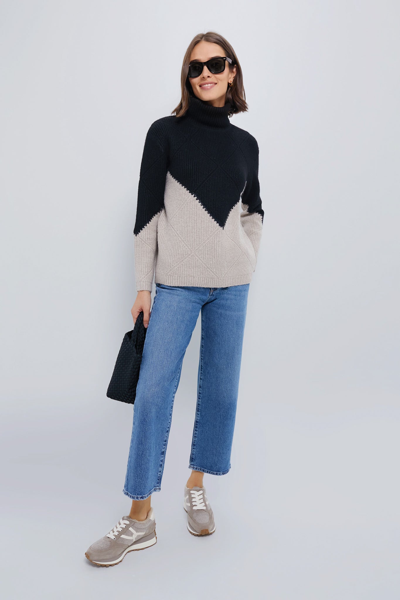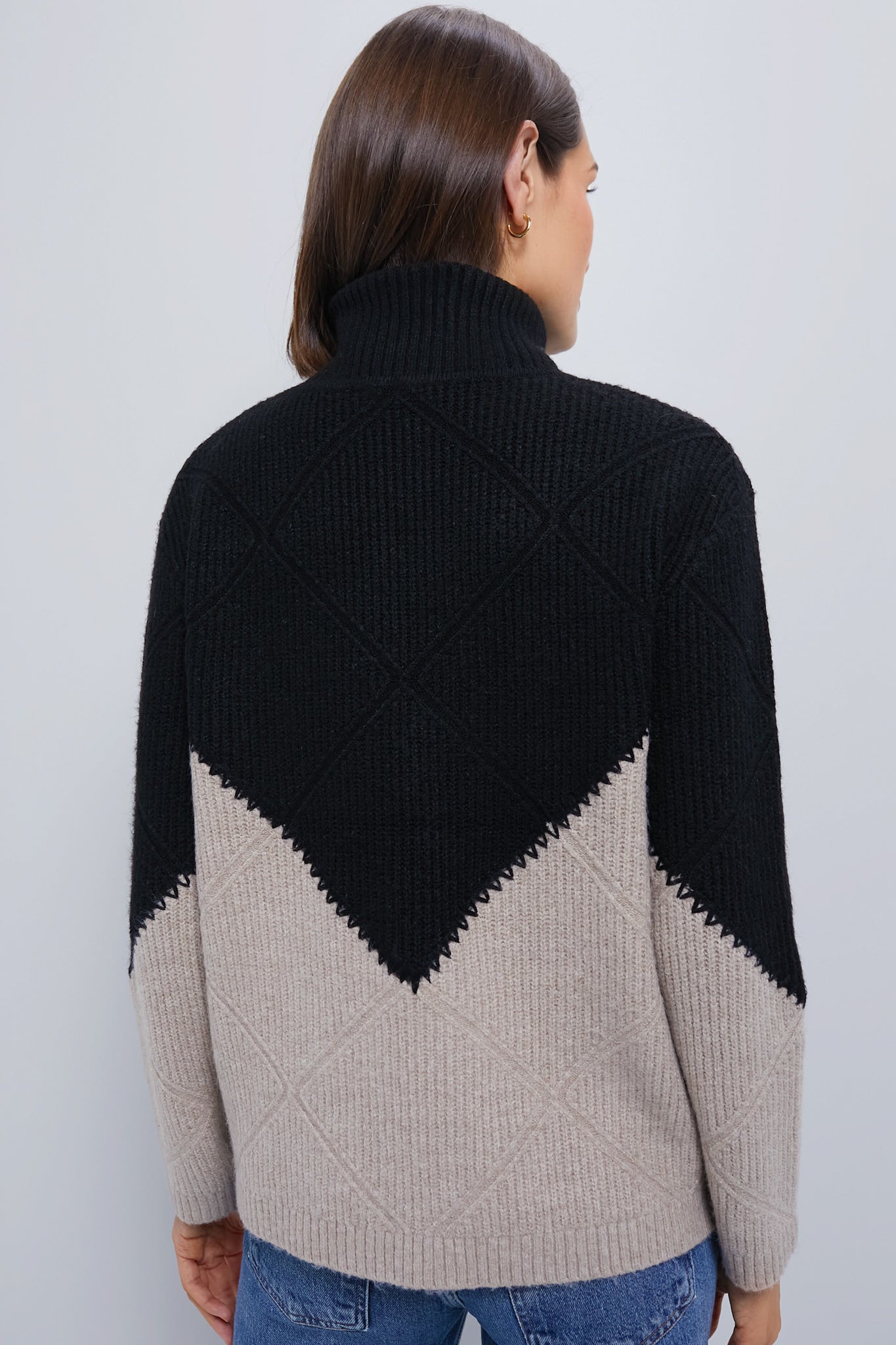Ultra-soft and stretchy midweight knit. with a color block pattern. shapes this cold-weather essential that has a turtleneck. long sleeves. and a relaxed bodice. The delightful whipstitching detail makes this pull-over unique and we love styling it with white denim and sandals for an effortless and breezy daytime look that'll take you from errands to lunch with ease.