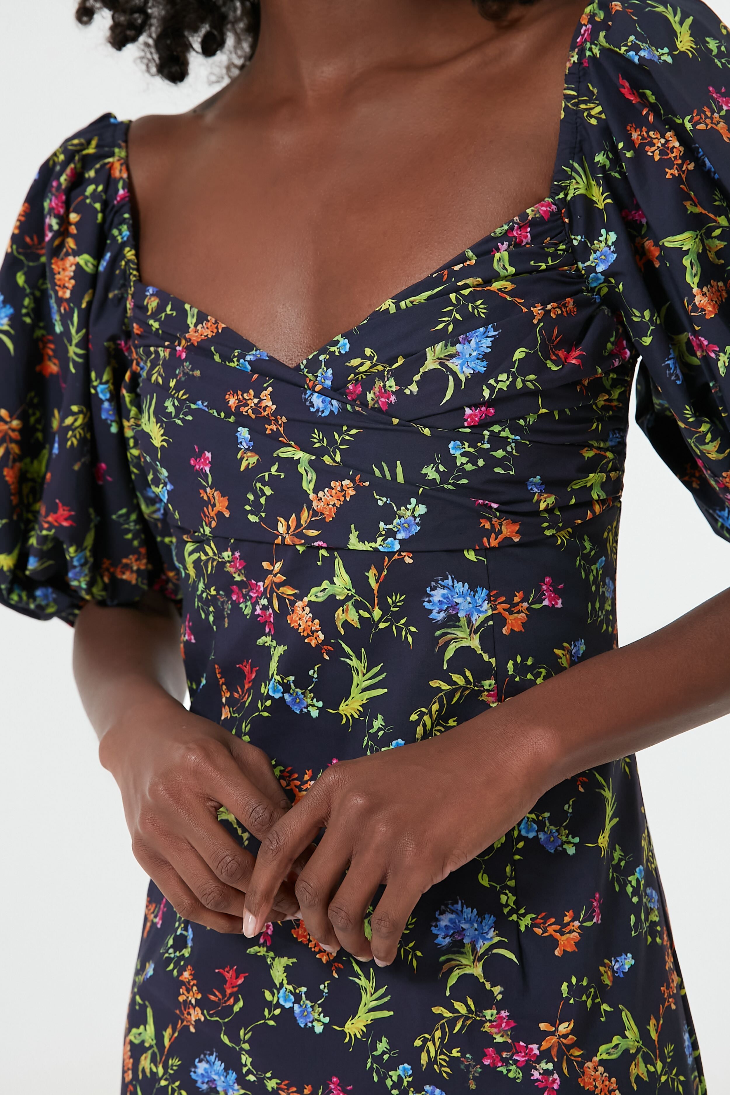 The Black Tropical Floral Bridget Dress is equal parts elegant and Glamorous. The knee-length skirt hugs your body all the way through the bodice. where it meets the underwire bustier and sweetheart neckline that accentuates your décolletage for the most flattering look. Complete with elasticated puff sleeves that you can wear on or off the shoulders. this stunning midi pairs well with bold heels to complement the pops of color throughout this flirty frock.